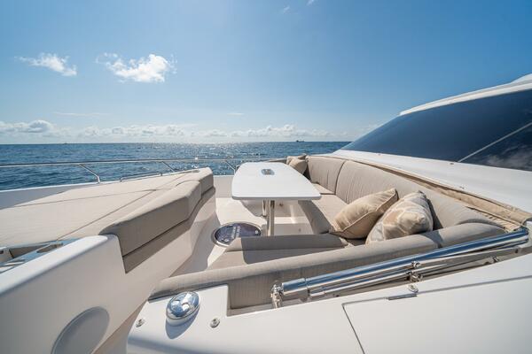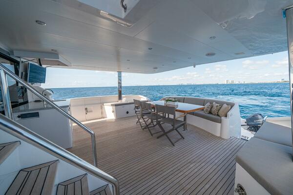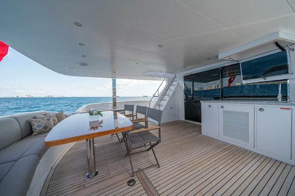 The aft deck is a highlight, featuring direct access to the port and starboard, full walkarounds to the bow, and a double staircase to the sundeck. Enjoy the centerline table, built-in settee, and a bar with custom granite counters, sink, ice maker, refrigerator, and TV. The sliding door merges interior and exterior spaces seamlessly. Line storage and aft cleats are discreetly enclosed for safety and aesthetics.