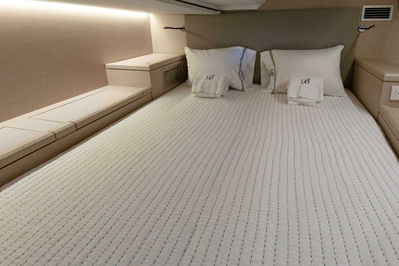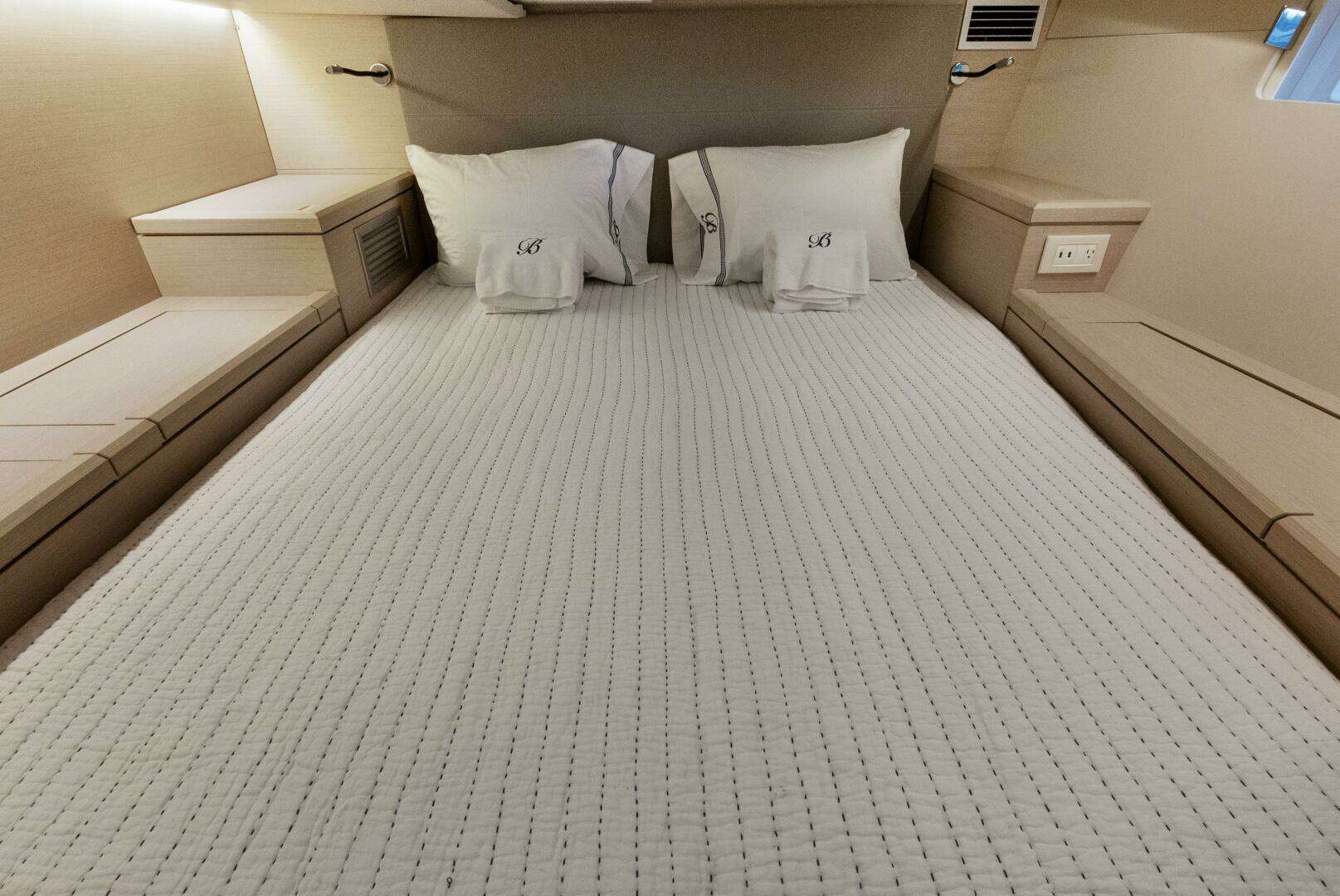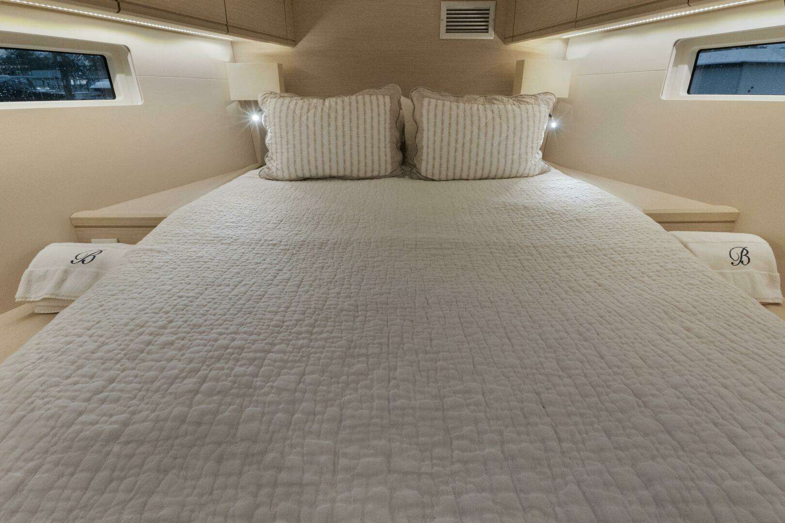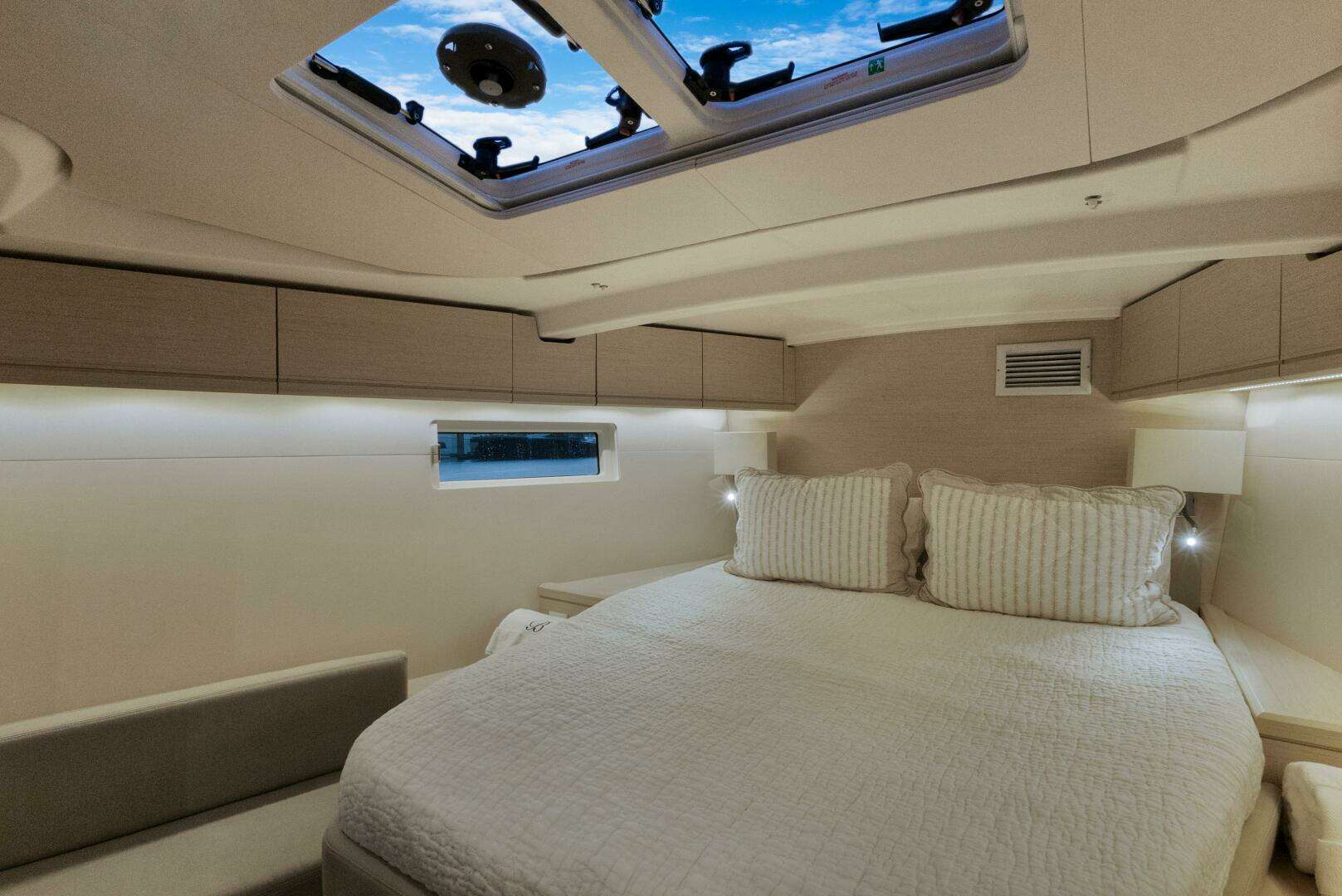 - Forward owner’s cabin with custom memory-foam mattress, mattress battens, upholstered headboard, electronic safe, reading lamps
