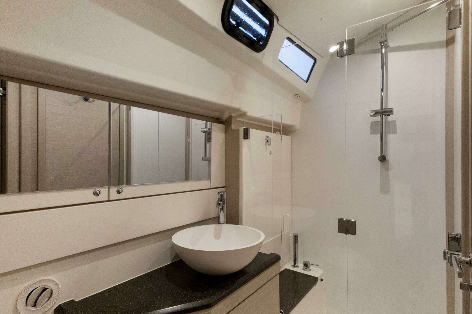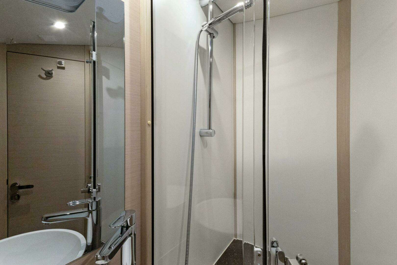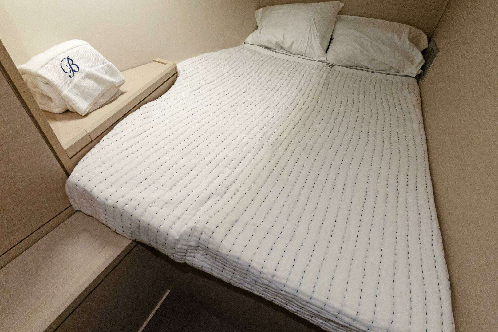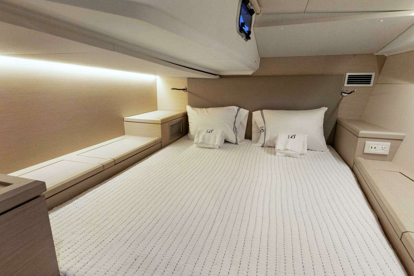 - Forward owner’s cabin with custom memory-foam mattress, mattress battens, upholstered headboard, electronic safe, reading lamps