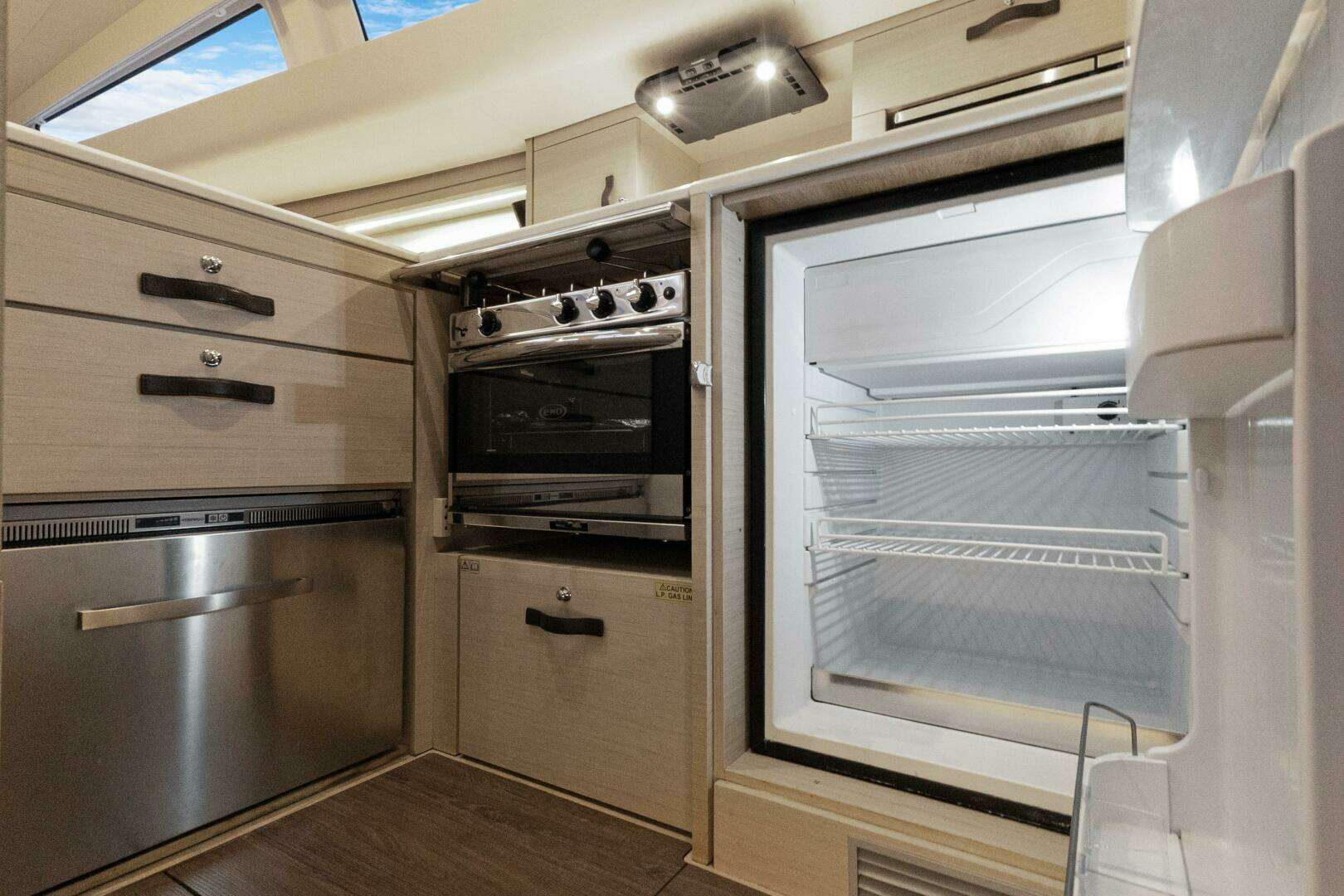 - Galley: additional refrigerator/freezer in utility room, freezer drawer + icemaker, microwave with overhead hood/fan/light, 12V refrigerator in cockpit table