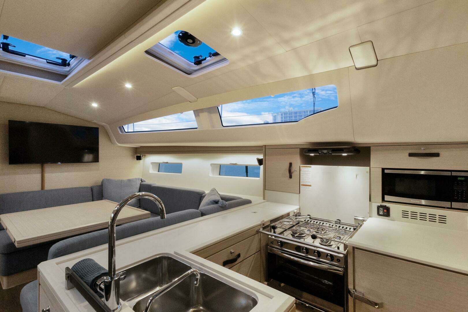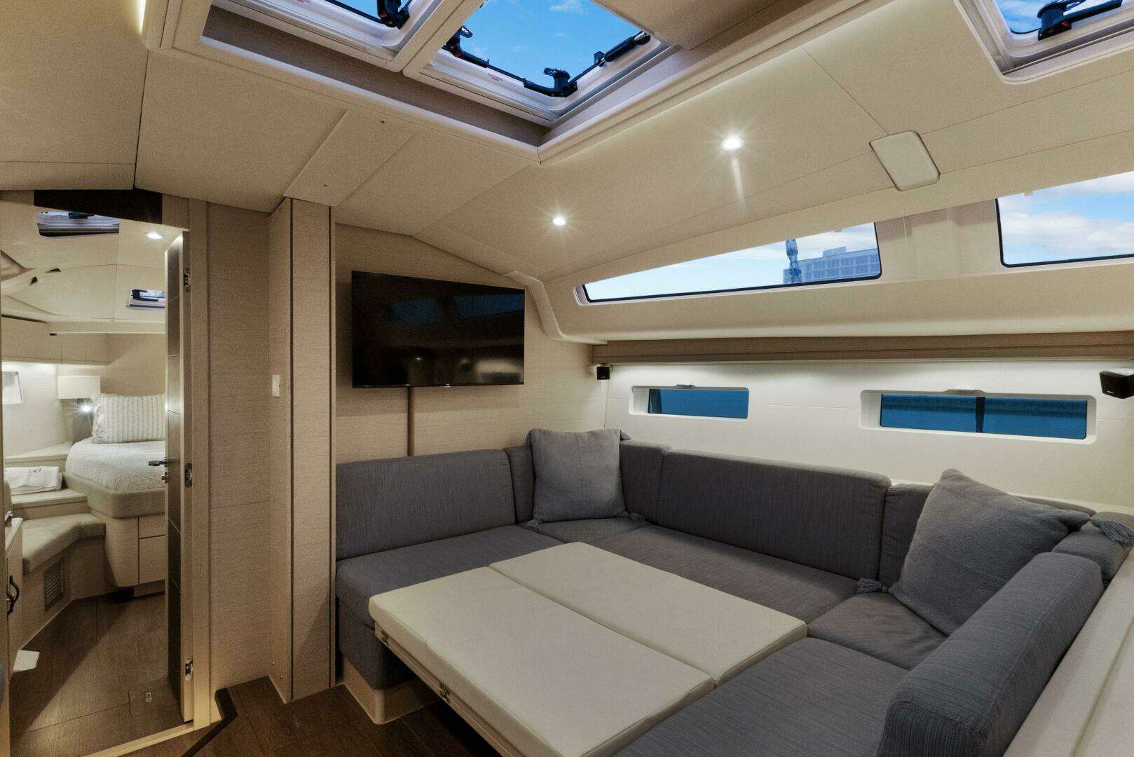 Beyond safety and ease, these upgrades also make BEATRICE the most fun Jeanneau 51 you can sail. With her North 3Di mainsail and jib, a North Helix Code 75 for reaching, and a dedicated North spinnaker, she has the sail power to deliver exhilarating performance in light air and heavy breezes alike. The Leisure Furl in-boom furling system supports a fully battened main for better shape and power, while modern running rigging and hydraulic controls keep her responsive and precise. The Performance package means she points higher, accelerates faster, and handles with the kind of authority that makes every passage a joy.