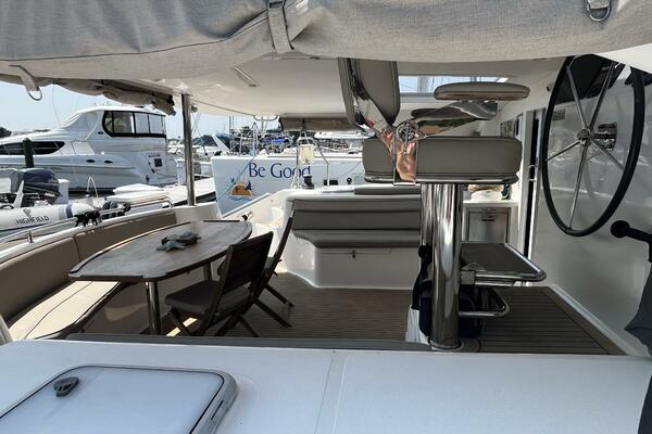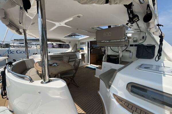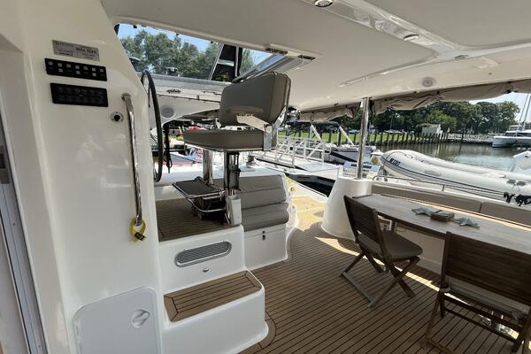 The wide, shallow transom steps and a large platform/dinghy davit which rises and lowers to double as a swim platform when at anchor, allow comfortable access to the boat from dinghy, water or dock. The curve of the transom seating area carries over to the transom walkway, creating pleasing lines and ease of movement between hulls, out of the way of those in the cockpit. The cockpit and helm area are designed with a focus on outdoor living and easy communication with the person at the helm.