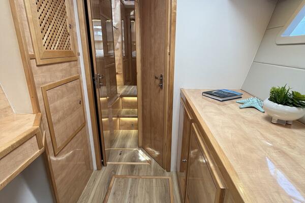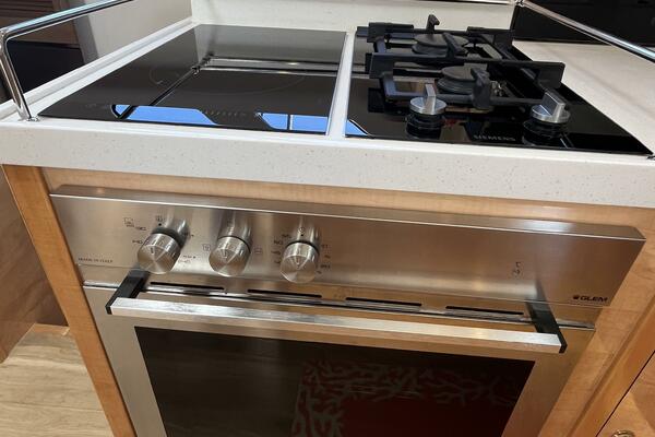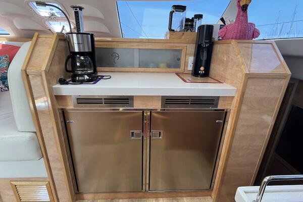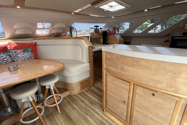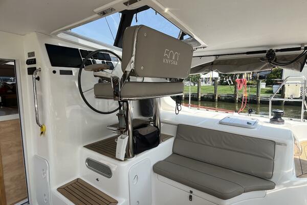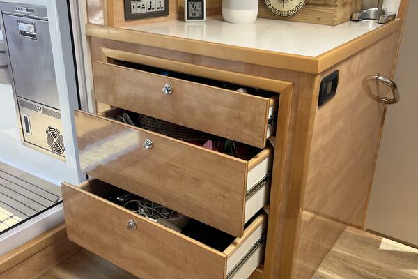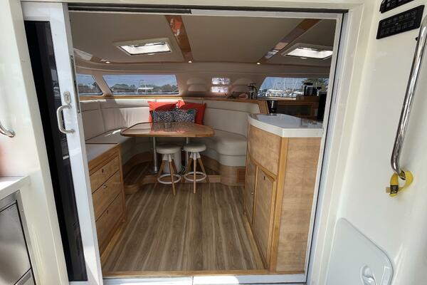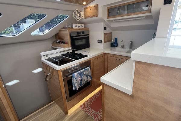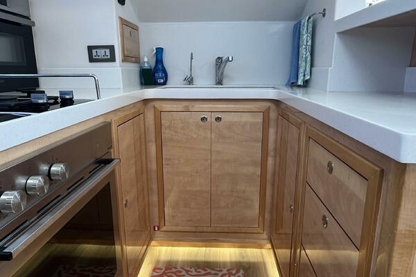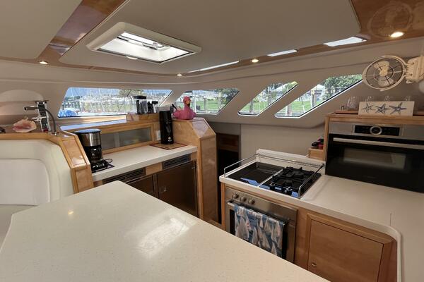 Construction of the Knysna 500 SE uses Vinylester resins and vacuum bagged Airex PVC foam core in hulls, decks and bulkheads. This results in a lightweight, stiff hull capable of handling any sea conditions. The interior finish is in high gloss, high quality, Pear veneer which is light and hard wearing. Storage cabinets have latticed door fronts for ventilation and aesthetic texture. The living spaces are well conceived, with creative use of space to provide extensive storage throughout and easy access to the yacht systems. Flow from interior to the expansive cockpit is seamless thanks to double sliding doors that open the full width of the doorway.