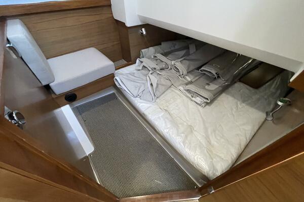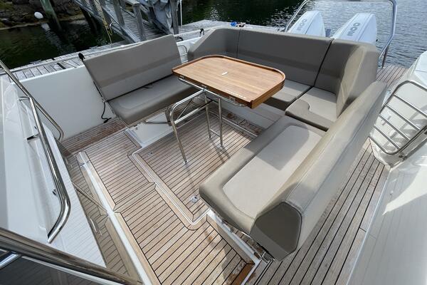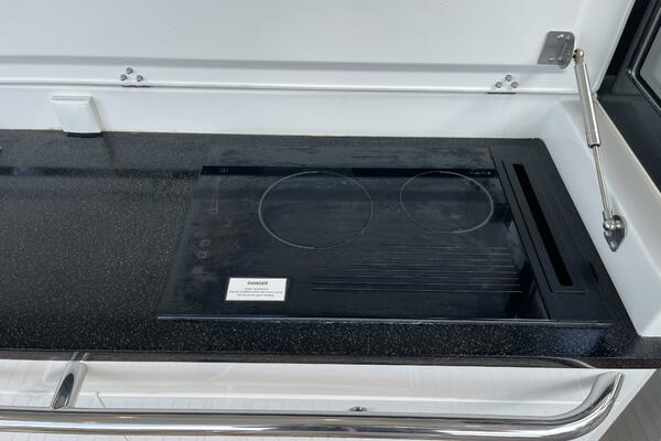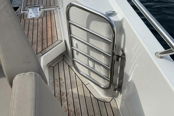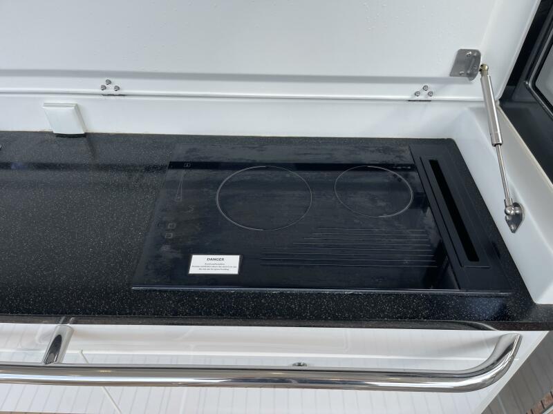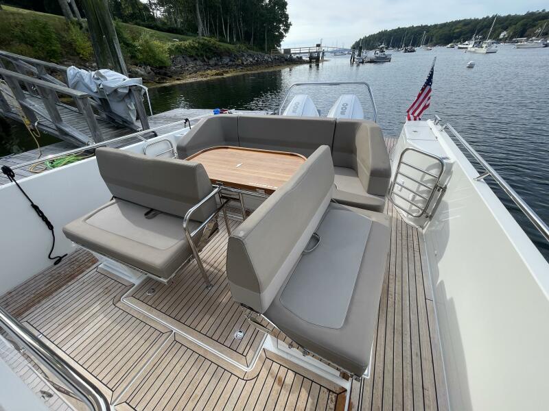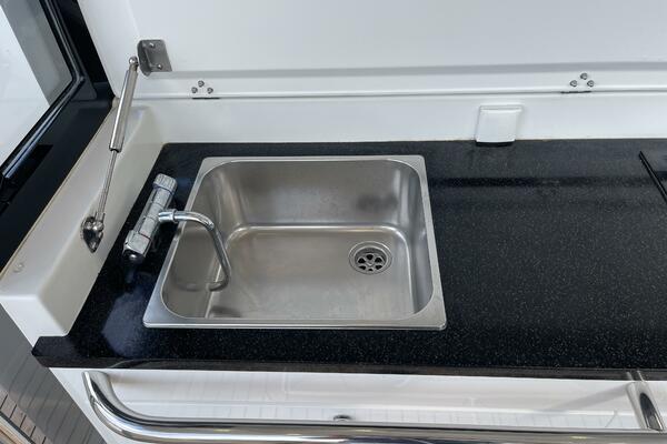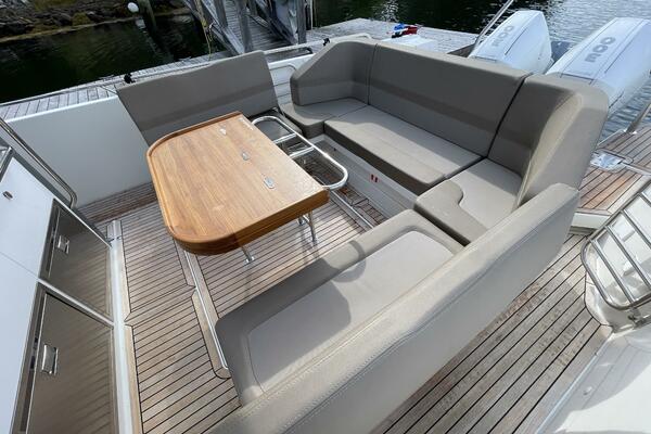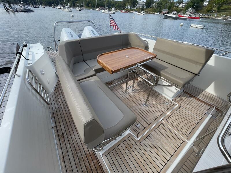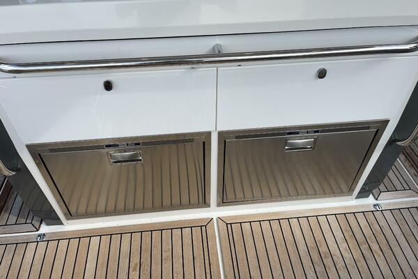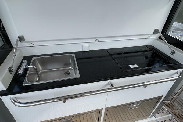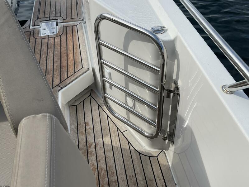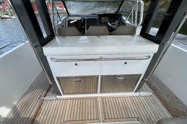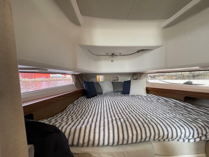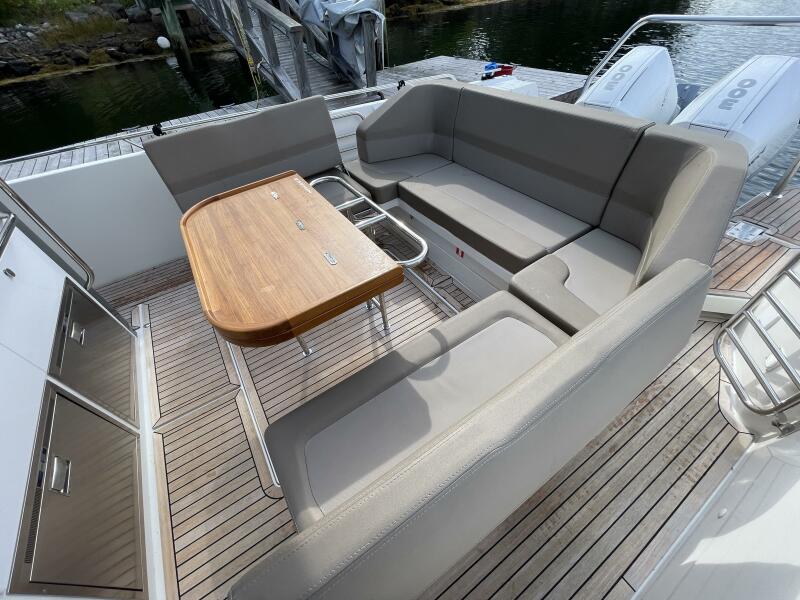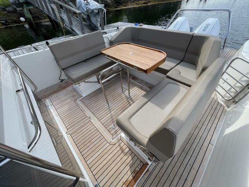 The lounge area has three sofas and a large table which, depending on its position, can function as a sun deck or a seating area that can either have all seats facing the direction of travel or alternatively facing one another. The outdoor kitchen has drawers for cutlery and tableware, a kitchen sink with hot water and space for a gas stove or electric grill. The large storage space measures just over 2500 liters and boasts a hydraulic opening mechanism that is easily accessible from the after-deck. It has space for everything you could ever want to bring with you, whether that be SUPs, sea bobs, wakeboards and biscuits or simply an inflatable rubber boat. The bathing platform and the after-deck are ample and easily provide enough space for several people at the same time.
