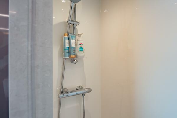 • Seamless fiberglass stall shower w/ one-piece glass door.