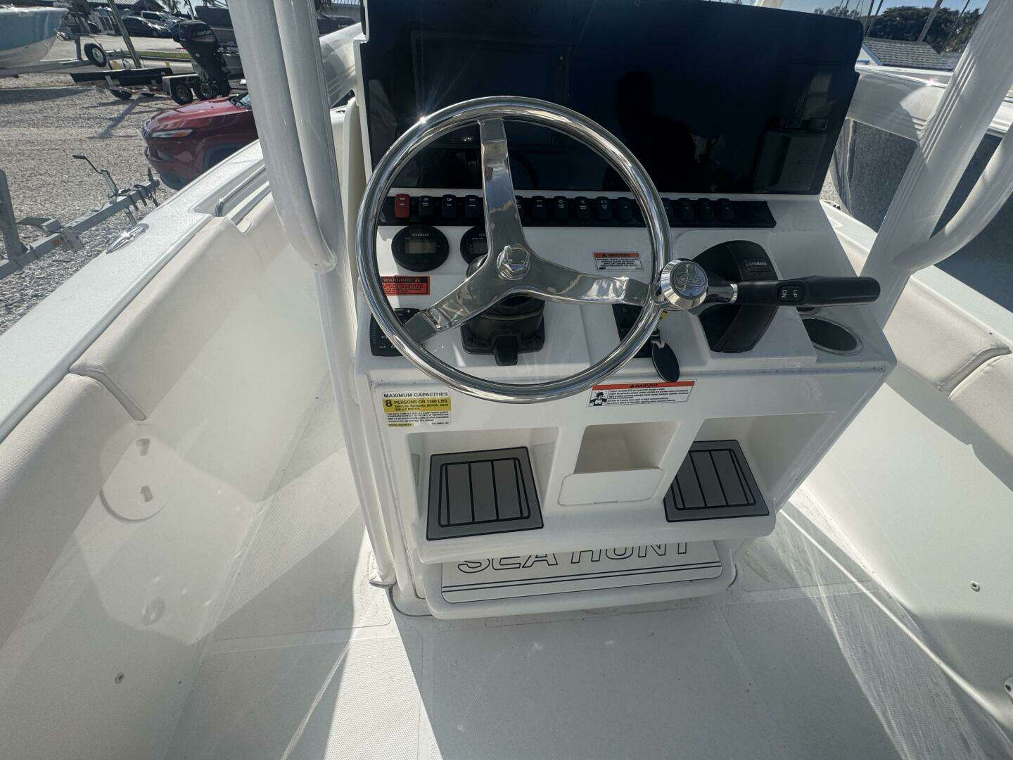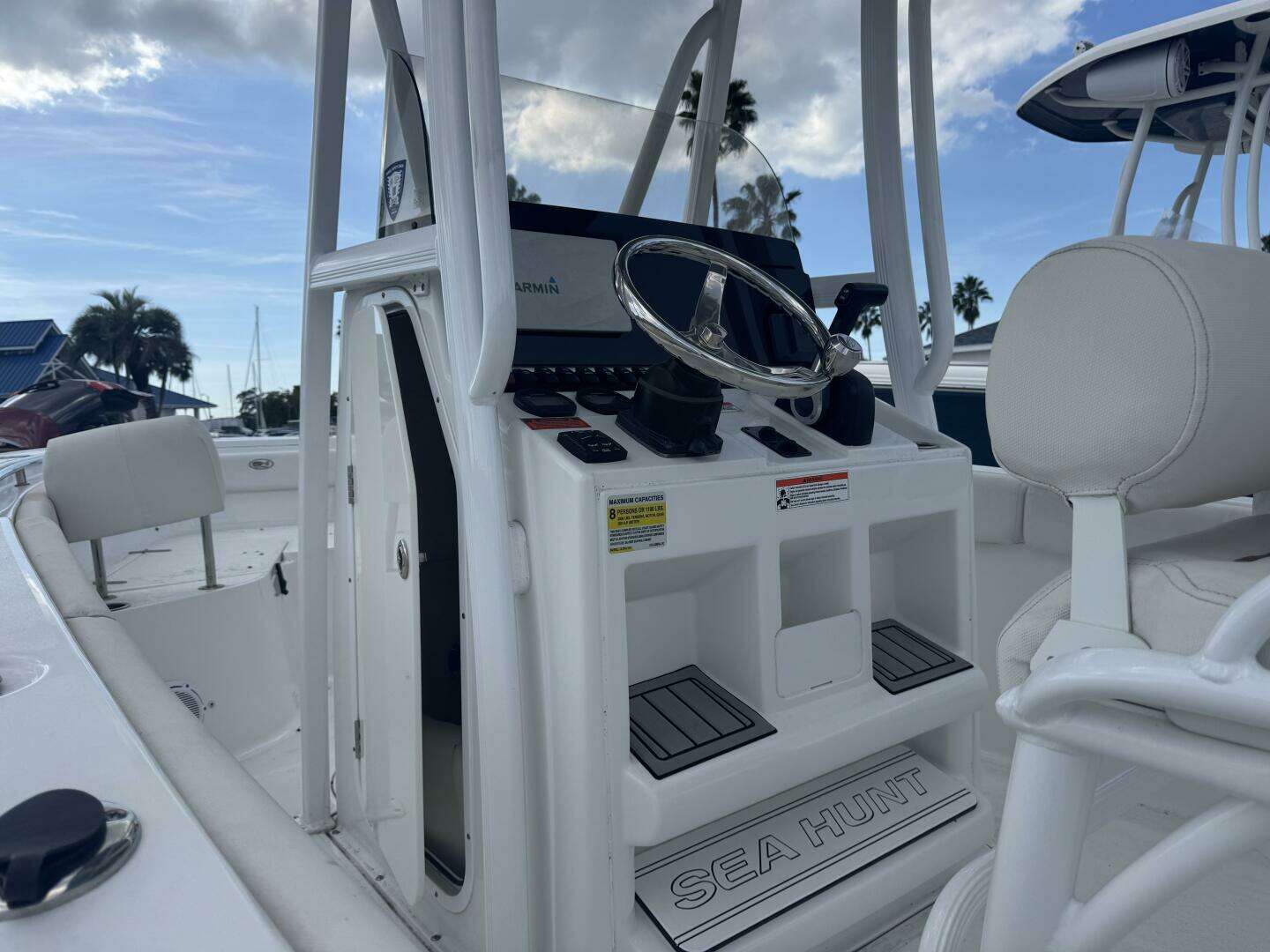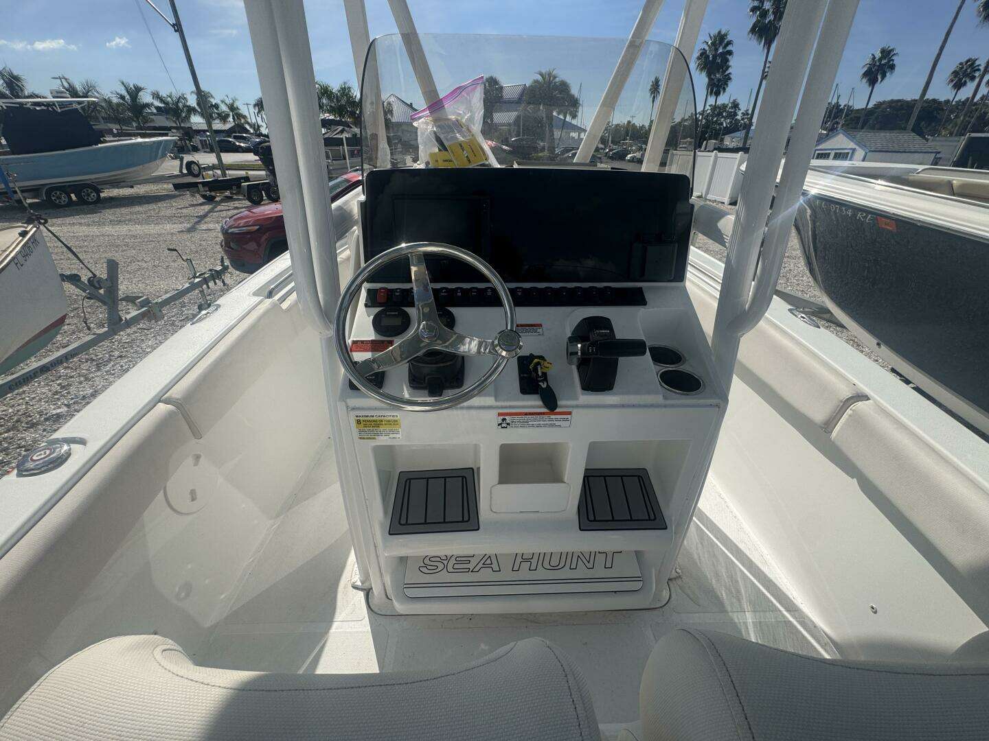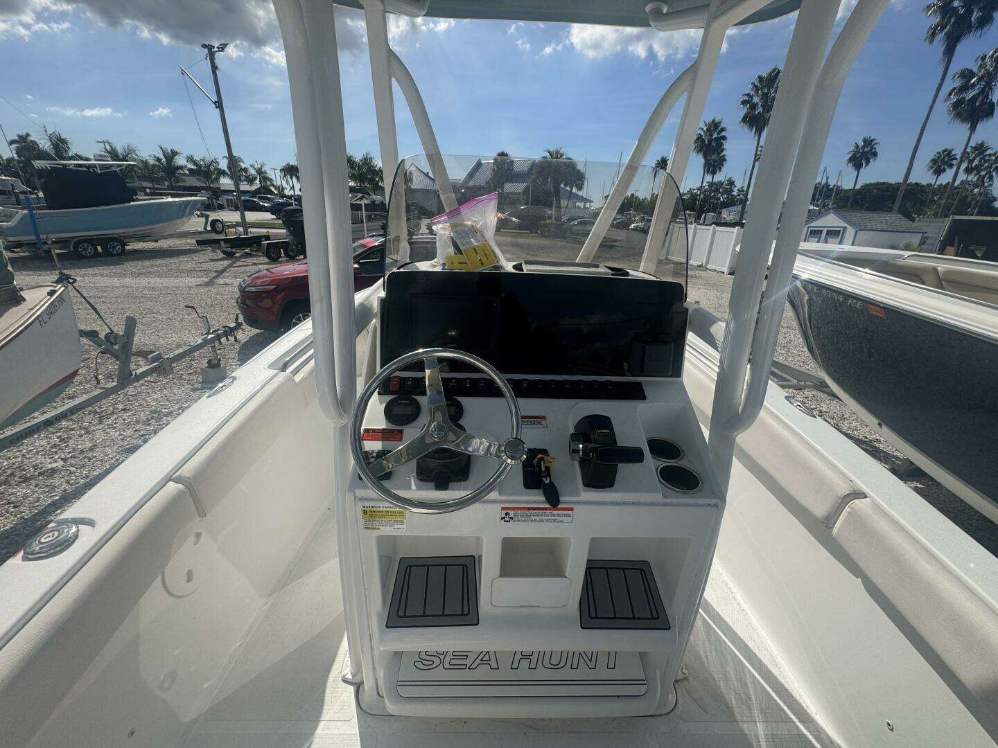 The 2021 Sea Hunt 219 Ultra is a family-friendly center console with a 21' 4" length , 8' 3" beam, 2350 lb dry weight, and a 60-gallon fuel capacity, designed for comfort and fishing, featuring plush seating, ample rod storage, a Garmin display, and standard Yamaha digital gauges, powered by outboards up to 200 HP, making it a versatile boat for day cruising and fishing.