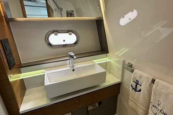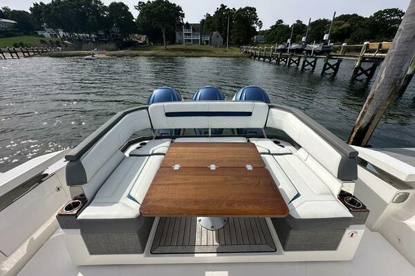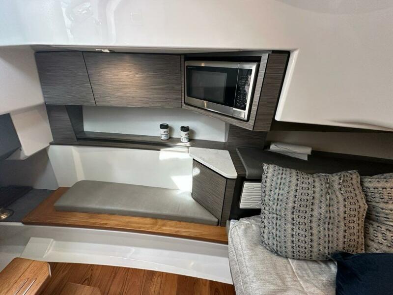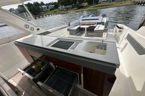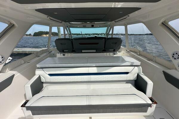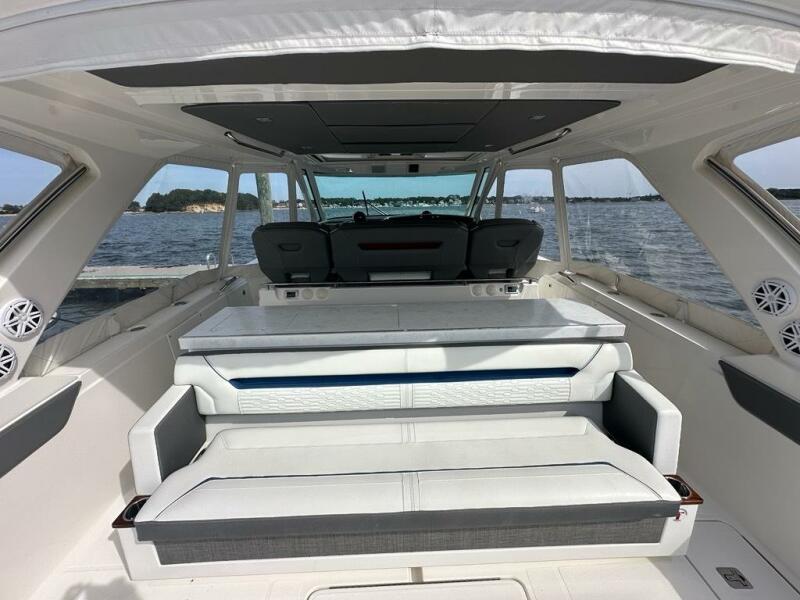 The sleek styling of the 43 LS is best complemented by power and performance. Yamaha® power combined with glass cockpit integrated electronics including Garmin® Marine navigation systems provide comfort and control at the helm. Optional Yamaha® helm master joystick steering offers an additional level of command at the dock or underway. A fuel capacity of 400 gallons combined with a top speed over 50 mph gets you to your favorite port of call fast, giving you more time to enjoy with family and friends.