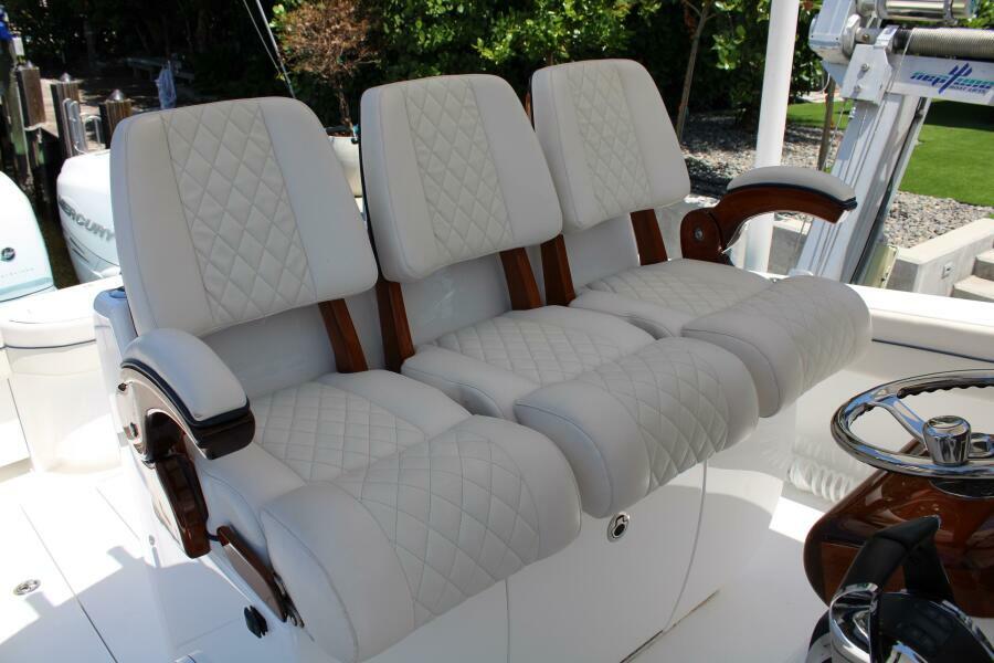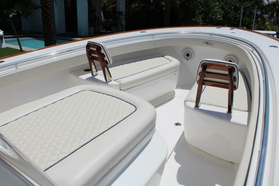 - Forward bench seating port and starboard with cupholders and storage beneath