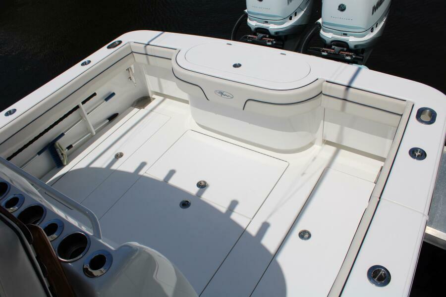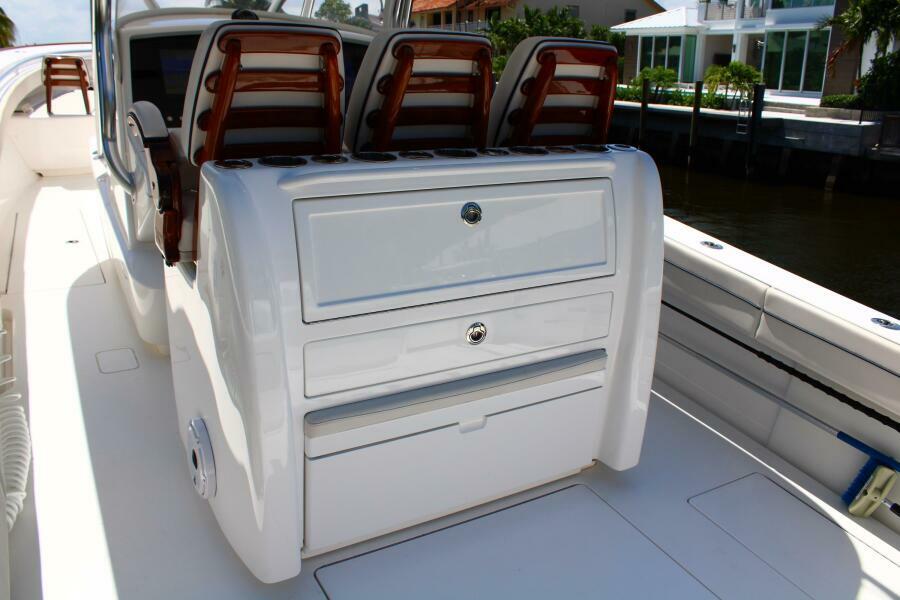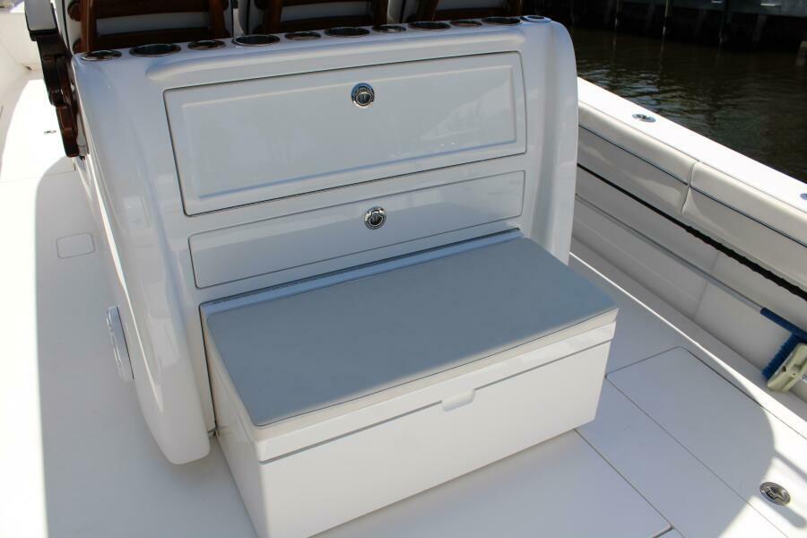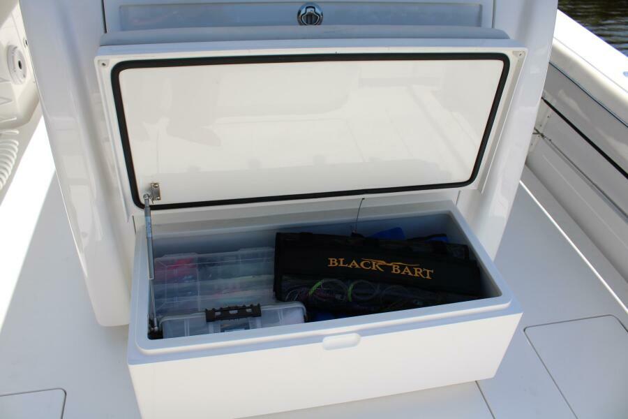 - Tackle center aft of helm seating with slide out cooler, (6) Gemlux rod holders and
