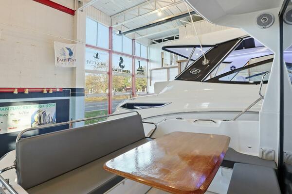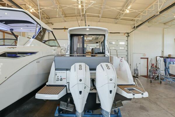 Inside Youngstown Showroom for easy viewing during the winter months! Twin White Mercury 200HP 4 Stroke Outboards with 33 Hours, Blue Hull, Bow Thruster, A/C-Heat, Comfort Trim Pack, Elegance Upholstery, Galley Pack, Sound Pack, Mooring/Anchor Kit, Electric Trim Tabs, Cooktop