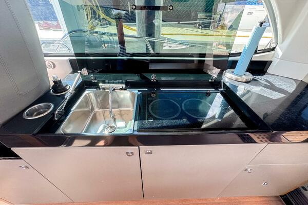 From the moment you enter the salon, you’re greeted with panoramic glass windows, a bright and modern interior, and finely appointed finishes that rival larger yachts. Below deck, two private cabins and an enclosed head offer generous overnight accommodations, while the expansive cockpit and forward sun lounge create multiple spaces for relaxation and entertaining.