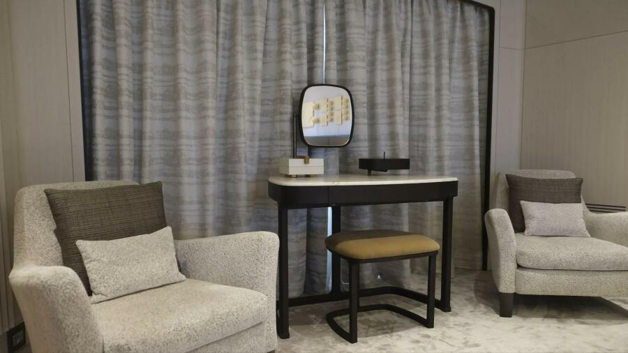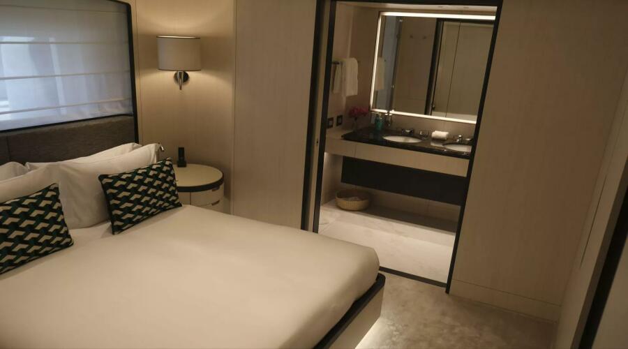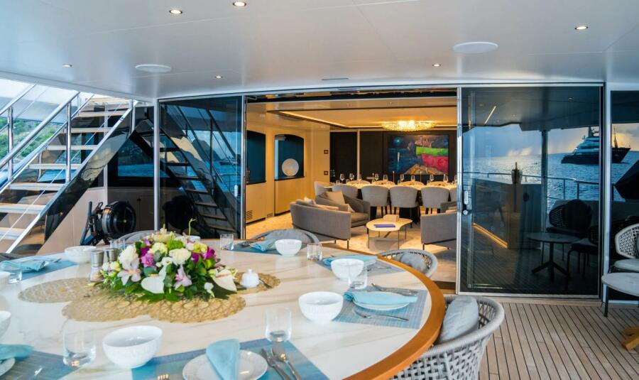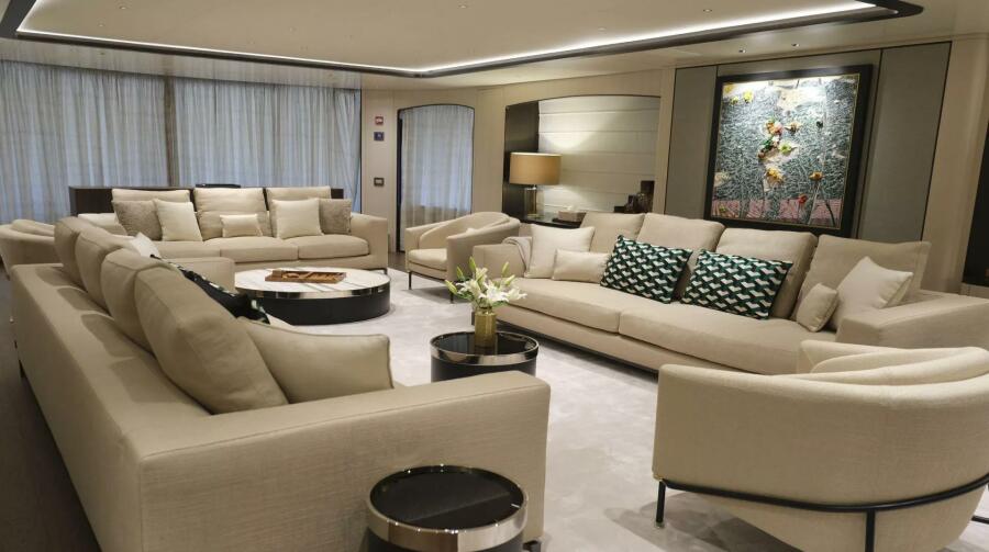 Brought to life by Achille Salvagni, WATERCOLOURS' interiors blend classic sophistication with modern flair, defined by bright neutral tones, warm furnishings, subtle hints of gold, and extensive marble use for an inviting atmosphere. Highlights include the upper salon and dining for intimate gatherings, a spacious main salon for lounging, an expansive full-beam master suite with large ensuite, dressing room, and gym, two VIP cabins for ultimate comfort, and two twin cabins with ensuites. Every space maximizes indoor-outdoor flow for a serene onboard experience.