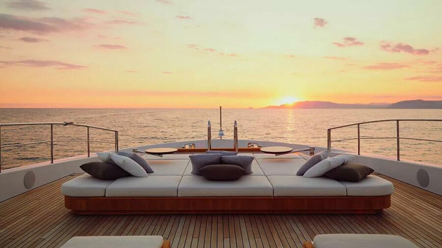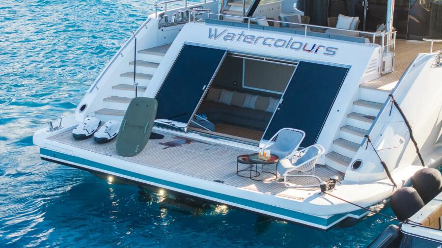Exterior: Inspiring Blissful Relaxation Designed by Giorgio M. Cassetta, WATERCOLOURS features a refined superstructure, high hull sides, and contemporary flared bow for understated elegance. Guests enjoy multiple outdoor spaces: a spacious sundeck with alfresco dining for 12, fully serviced bar, foredeck sun pads and jacuzzi for sunbathing or cocktails, upper deck with circular dining table and expansive seating, main aft-deck dining for relaxed meals, and an elegant beach club with expansive swim platform for seamless water access. Superlative amenities across all decks promote rest and rejuvenation.