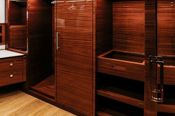 With a gross tonnage of 183 GT, the yacht offers generous space for up to 10 guests and a crew of 4. The interior features a classic design with dark wood finishes, blue and white accents, and a spacious owner’s suite.