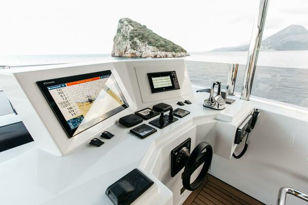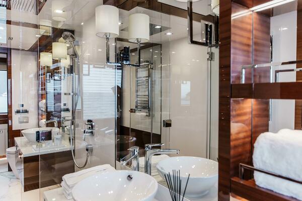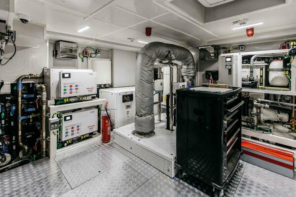 The yacht is equipped with two stabilization systems—gyroscopic and hydraulic—that work together to reduce motion in various sea conditions, enhancing comfort during long passages.