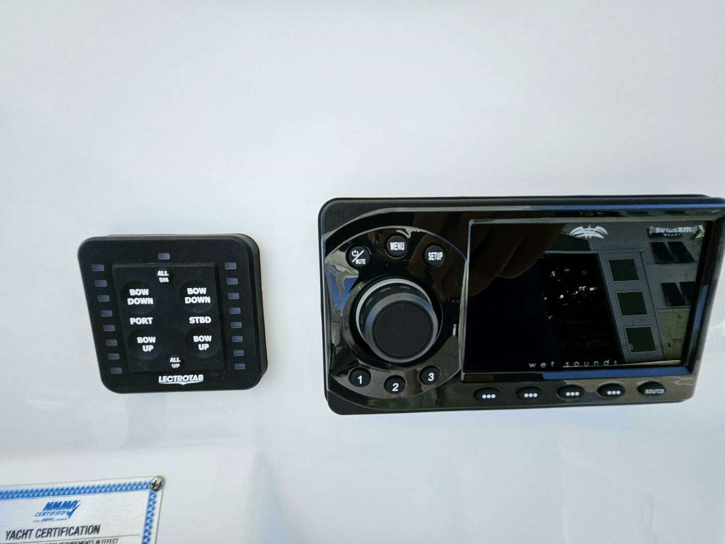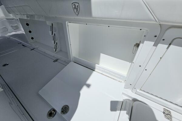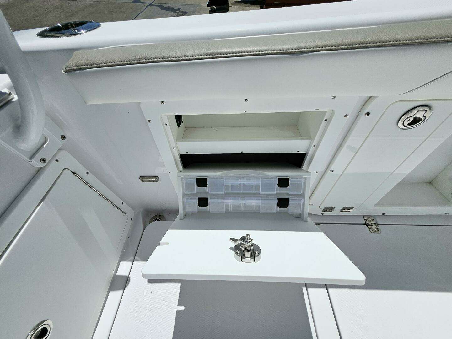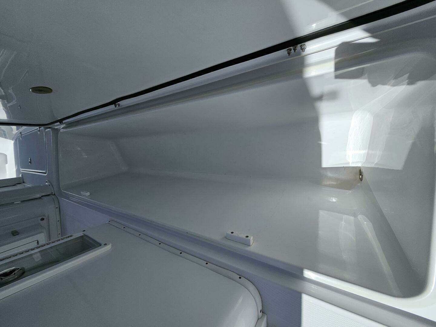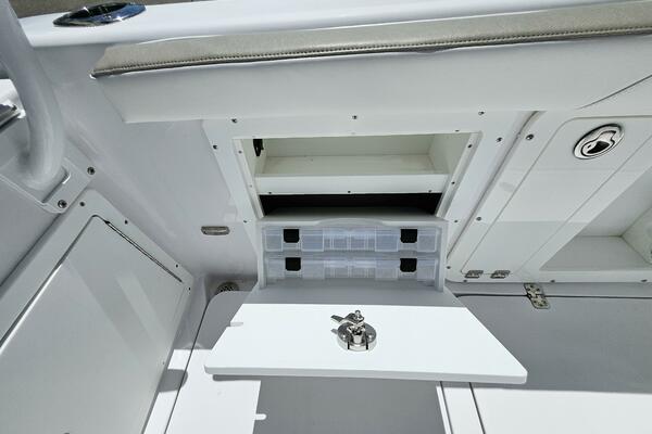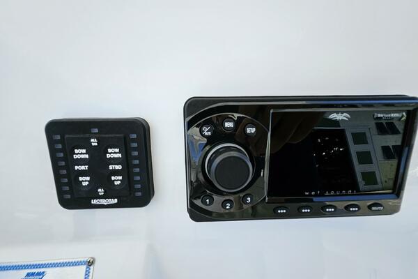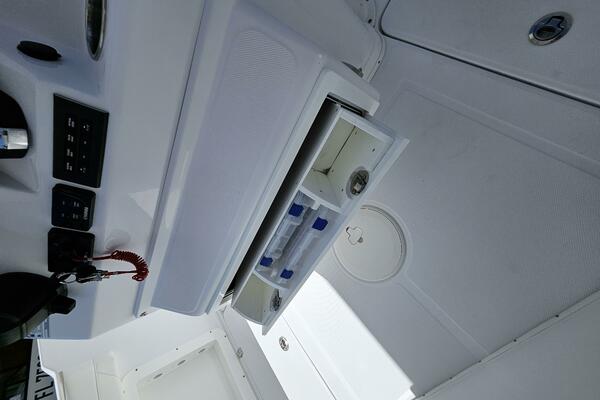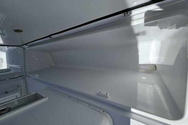 The helm experience is made much more pleasant under the shade of a large stylish hard top framed with D-tubed pipework and a three-sided glass enclosure. A blacked out acrylic helm face with large twin multi-function display units is easily viewable and seating for both the helmsman and companion chairs are multi-faceted contoured captain chairs with independent electric powered controllers. A tackle station behind the seating and Frigid Rigid cooler below are also standard equipment. Add Bennet trim tabs with lighted position indicators- a Wet Sounds Marine Media Center with four 6.5” speakers and amplifier and Optimus Electronic Steering- again, each are also standard equipment.