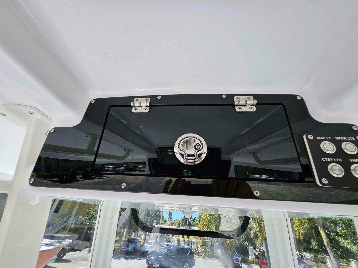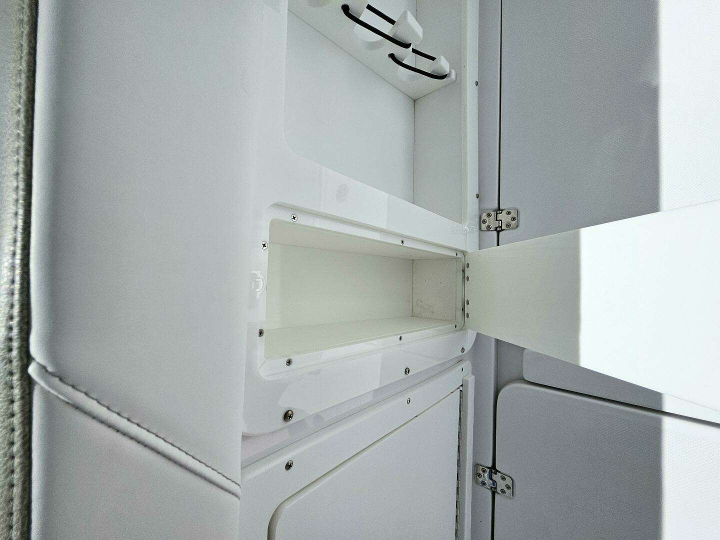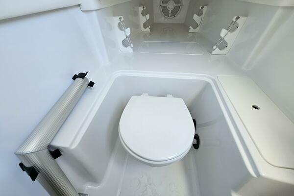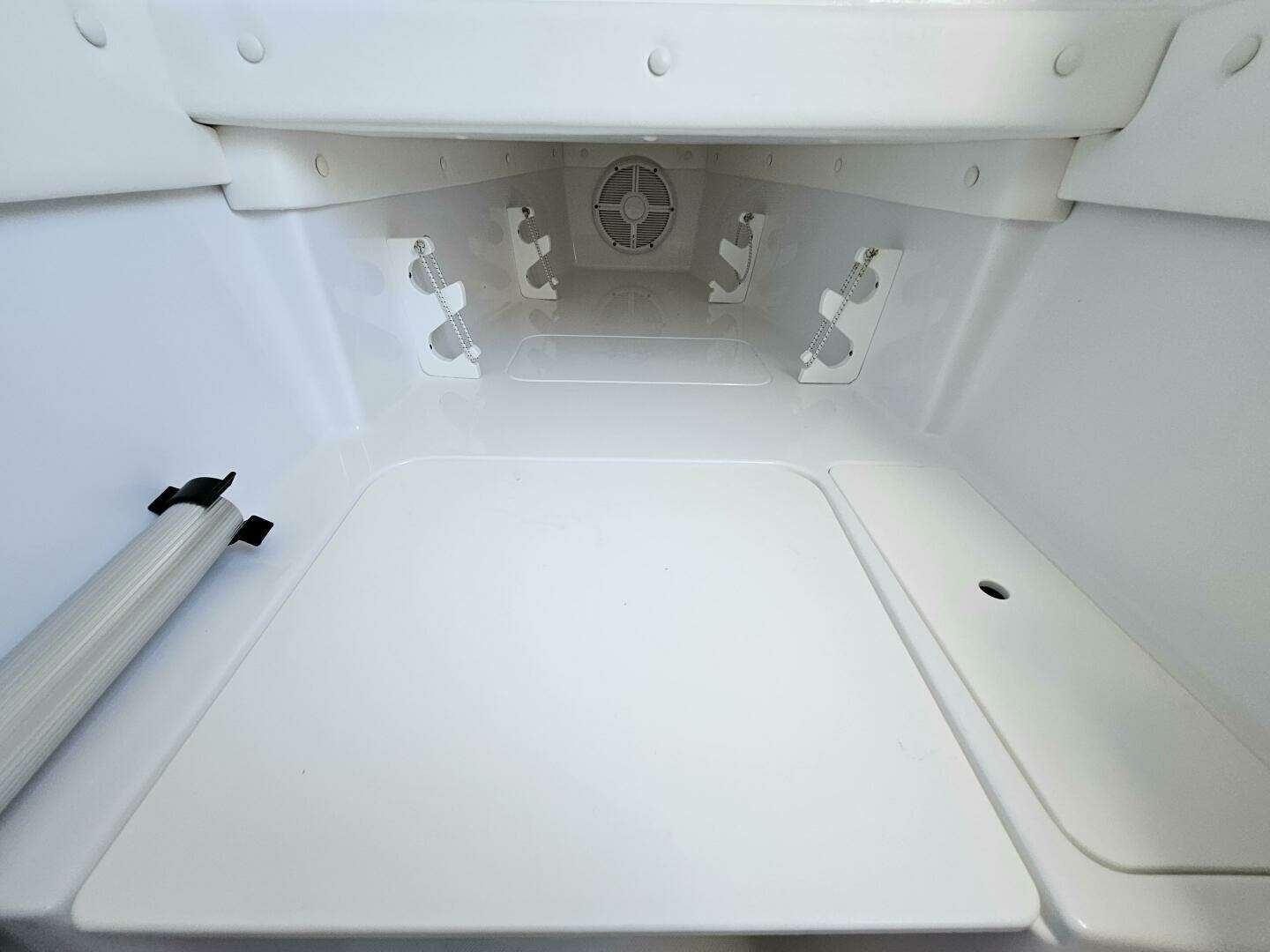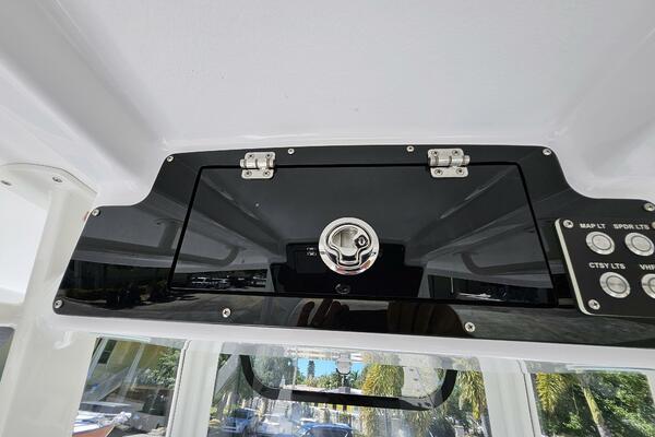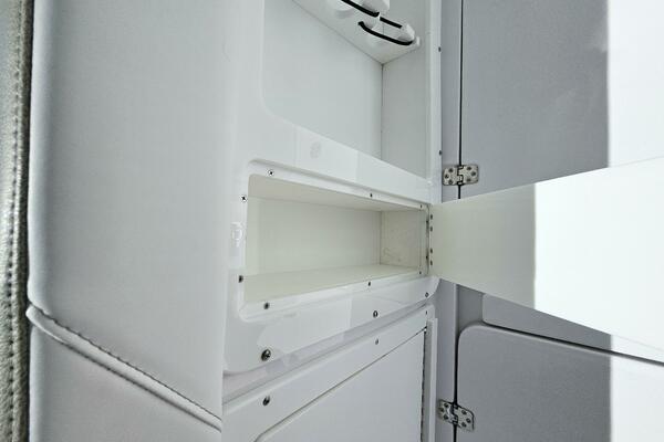 The helm experience is made much more pleasant under the shade of a large stylish hard top framed with D-tubed pipework and a three-sided glass enclosure. A blacked out acrylic helm face with large twin multi-function display units is easily viewable and seating for both the helmsman and companion chairs are multi-faceted contoured captain chairs with independent electric powered controllers. A tackle station behind the seating and Frigid Rigid cooler below are also standard equipment. Add Bennet trim tabs with lighted position indicators- a Wet Sounds Marine Media Center with four 6.5” speakers and amplifier and Optimus Electronic Steering- again, each are also standard equipment.