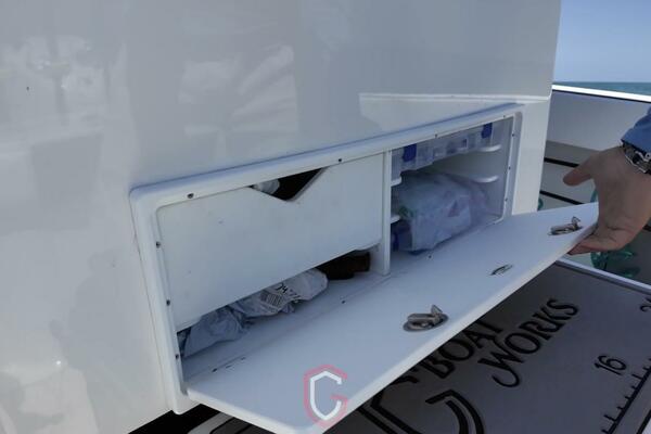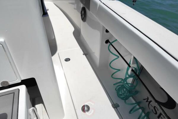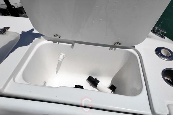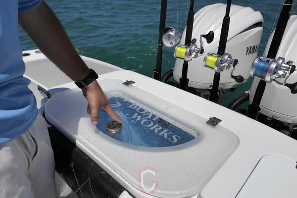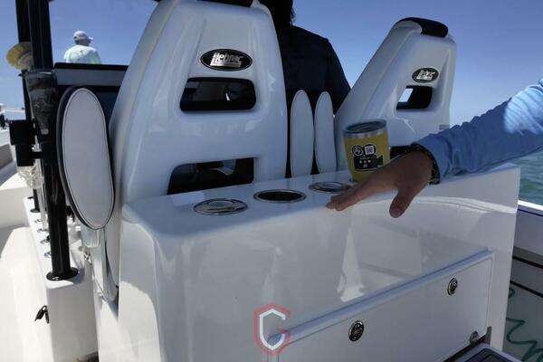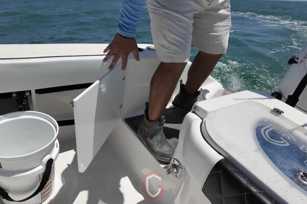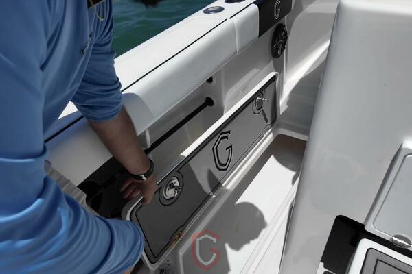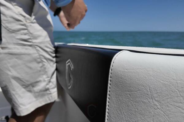 Entertainment and comfort are built into every corner of this boat. The JL Audio sound system includes eight JL 8.8” M6 speakers, two 6.5” M6s, and a Fusion stereo head unit for powerful, crystal-clear sound. The front sun pad lounger, custom Llebroc helm seating with four armrests, and Taco Sunshade make long days on the water more enjoyable. The CG 35 M-Series also features a Frigid Rigid roll-out cooler seat, large tackle center, and dual livewells—a 40-gallon baitwell and 12-gallon shrimp well—making it tournament-ready and angler-approved.