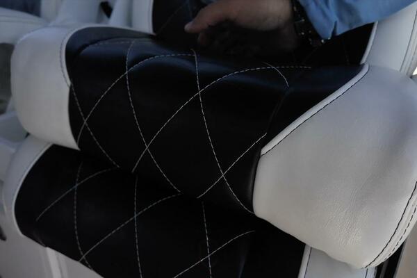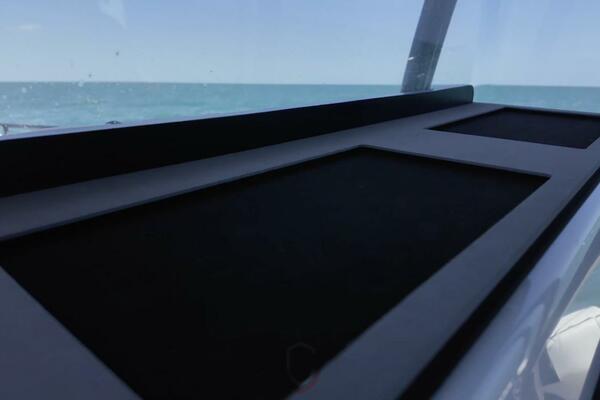 The boat’s custom Ice Blue hull is accented by white powder-coated metalwork and a white rub rail with stainless steel insert, blending aggressive performance with head-turning style. The interior features premium Silicon CG Crest stitching, delivering a refined look and feel throughout. Twin 12” Garmin displays offer seamless navigation, fishfinding, and depth readings, while Mercury VesselView gives you complete control and monitoring of the engines.