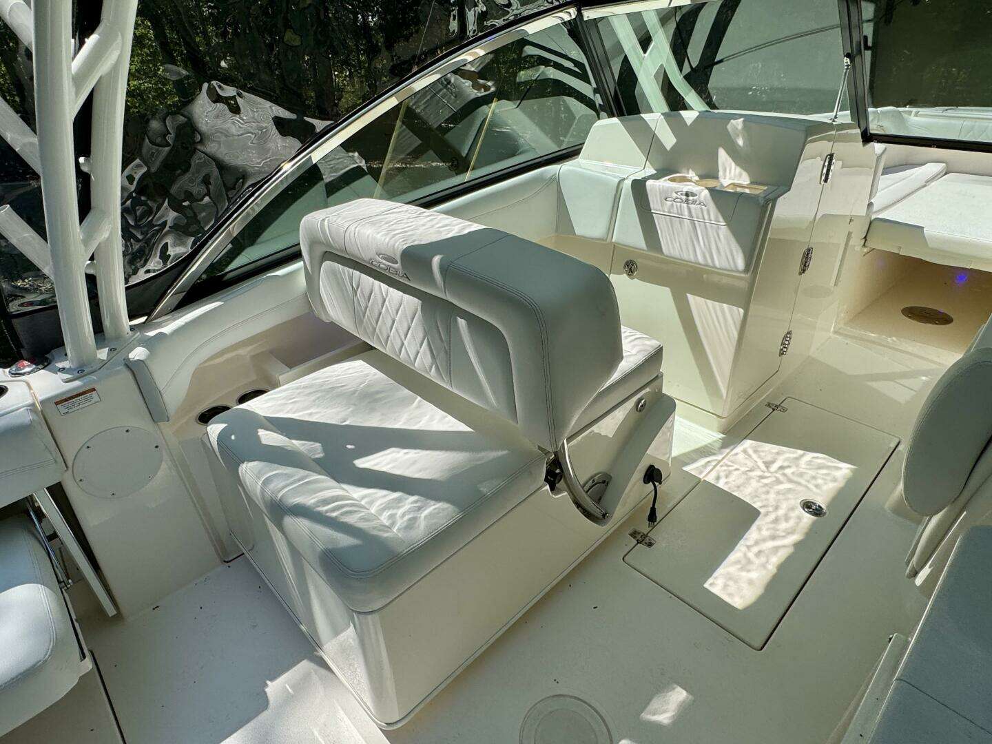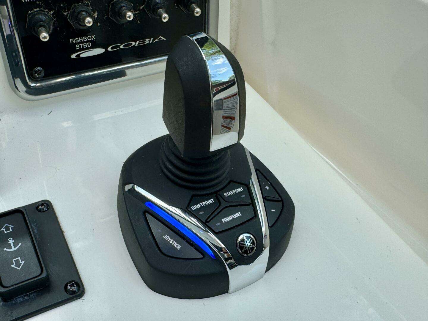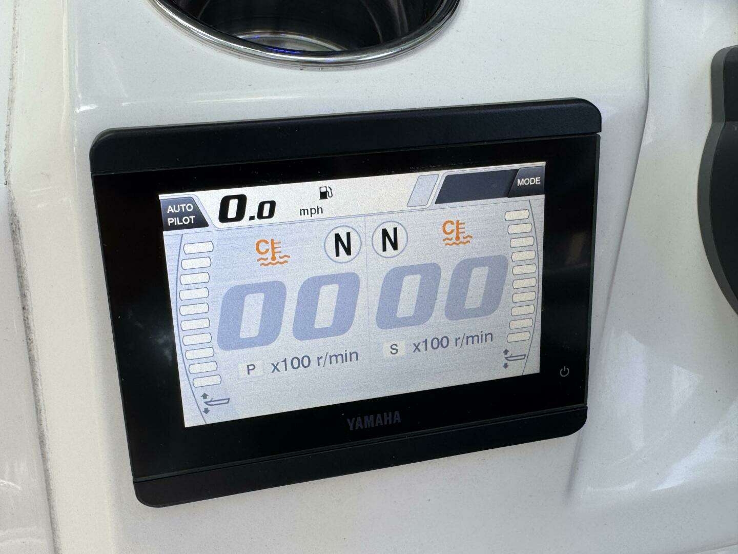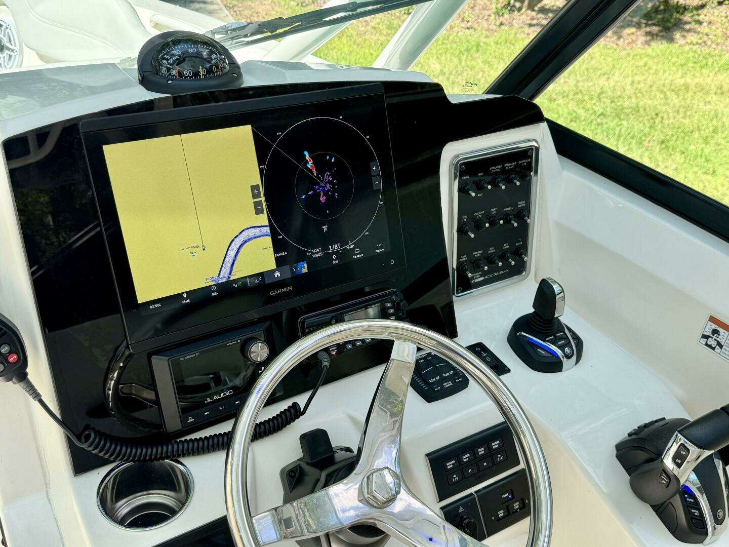 Powered by twin 250HP Yamaha 4.2L V6 4-stroke outboard motors equipped with Yamaha HelmMaster EX w/DES (Digital Electric Steering), joystick steering, Yamaha auto pilot, wireless key FOB, Yamaha command link plus CL5 touchscreen, Bennett trim tabs with indicator gauge, a 4-way electric helm seat with flip-up bolster & fold down arm rests, a GEM stainless steel hydraulic tilt steering wheel with power knob, VHF radio, Ritchie compass, a Garmin GPSMap 8616xsv multi-function touchscreen with integrated GPS/chartplotter/depth/fish finder/sonar and Garmin fantom 24 radar. Also controlled from the helm station is an upgraded Lewmar stainless steel deluxe windlass anchor w/300' line upgrade, a driver side windshield wiper w/washer fluid, easy access battery selector switches for a 4-bank group 31 AGM batteries with 4-bank onboard battery charger, and a JL Audio AM/FM/USB/Aux/Bluetooth/Satellite-ready stereo with amplifier and 8 speakers.