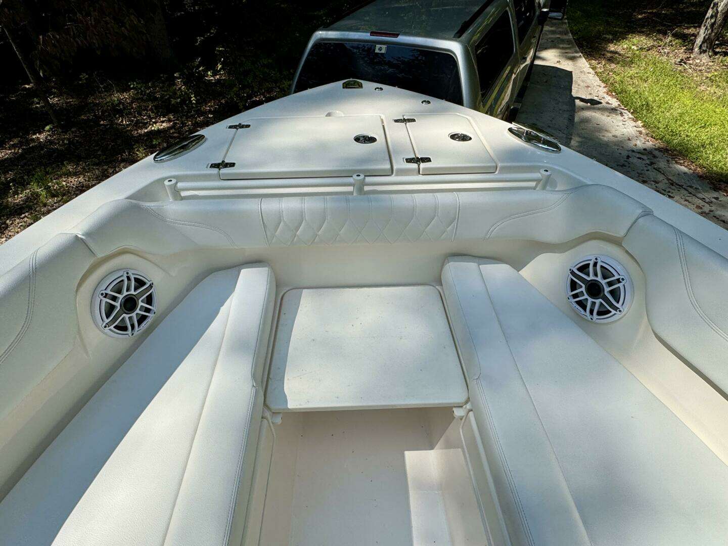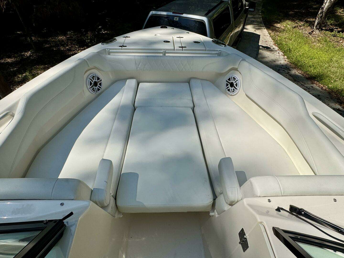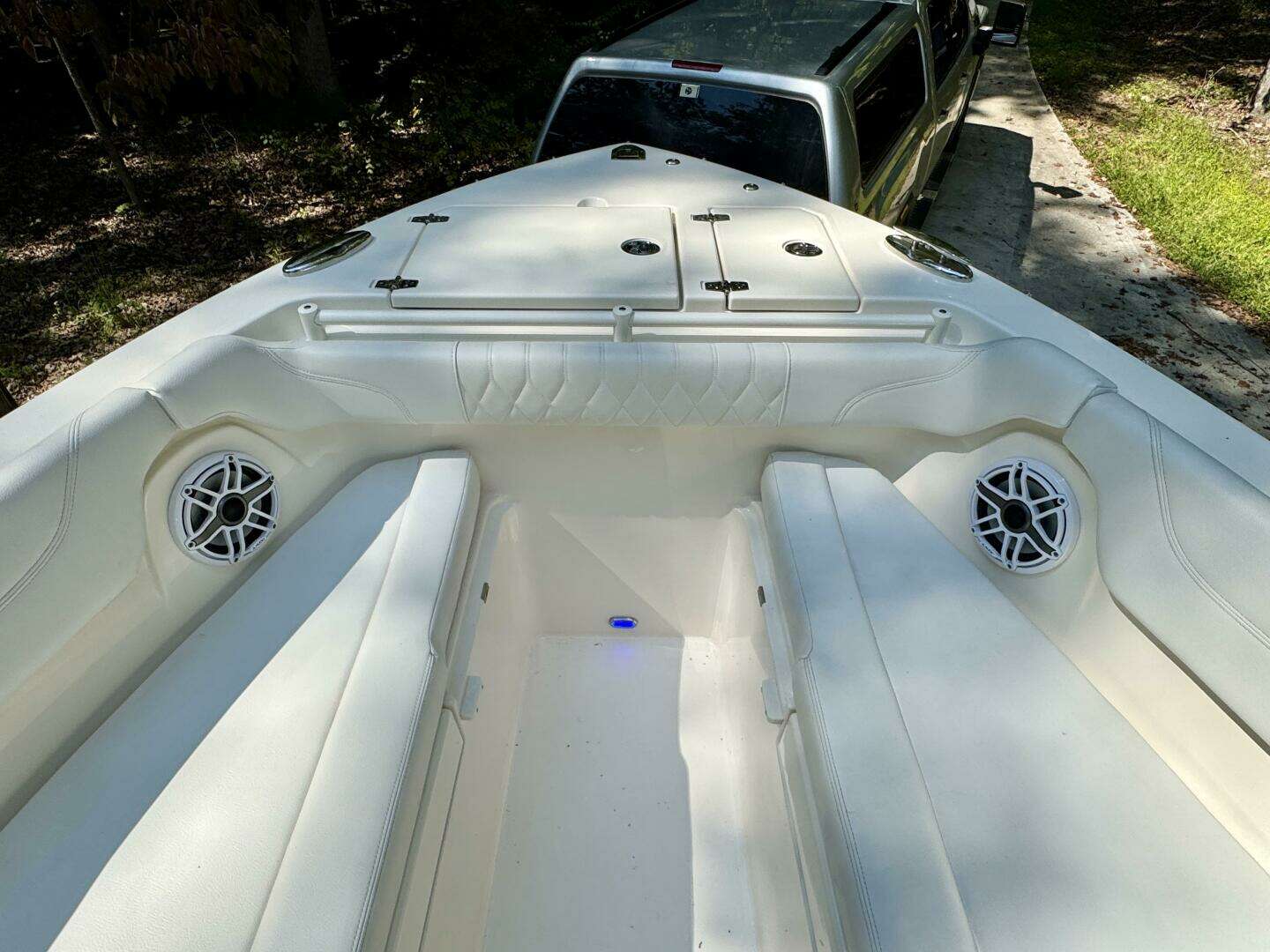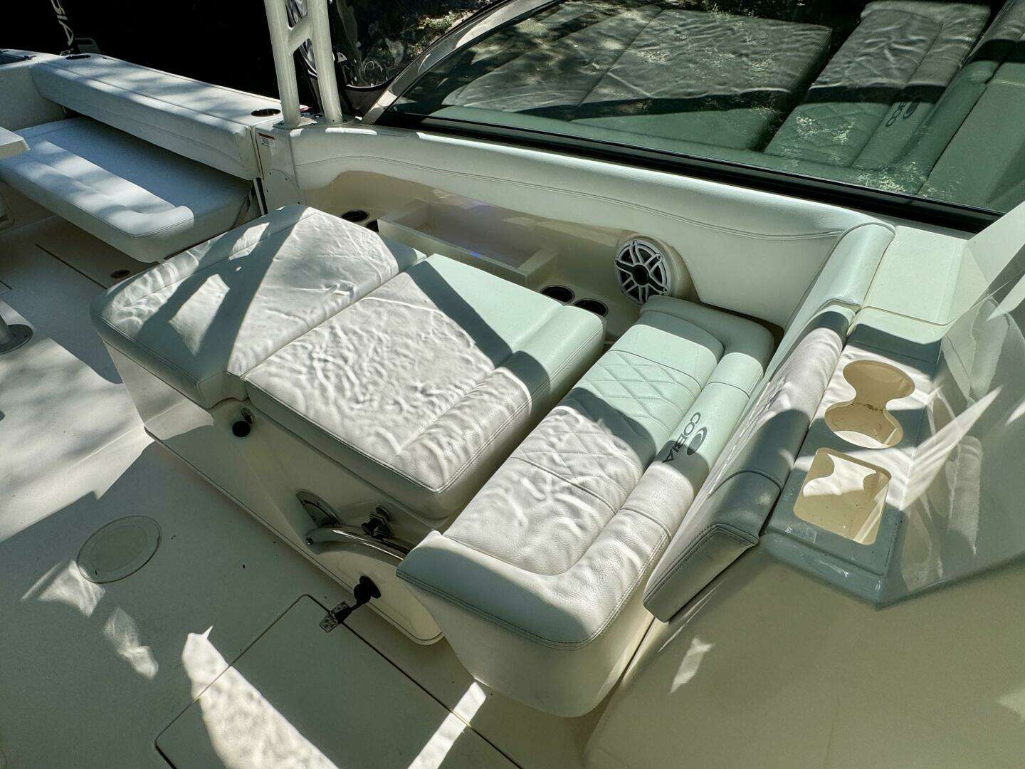 Powered by twin 250HP Yamaha 4.2L V6 4-stroke outboard motors equipped with Yamaha HelmMaster EX w/DES (Digital Electric Steering), joystick steering, Yamaha auto pilot, wireless key FOB, Yamaha command link plus CL5 touchscreen, Bennett trim tabs with indicator gauge, a 4-way electric helm seat with flip-up bolster & fold down arm rests, a GEM stainless steel hydraulic tilt steering wheel with power knob, VHF radio, Ritchie compass, a Garmin GPSMap 8616xsv multi-function touchscreen with integrated GPS/chartplotter/depth/fish finder/sonar and Garmin fantom 24 radar. Also controlled from the helm station is an upgraded Lewmar stainless steel deluxe windlass anchor w/300' line upgrade, a driver side windshield wiper w/washer fluid, easy access battery selector switches for a 4-bank group 31 AGM batteries with 4-bank onboard battery charger, and a JL Audio AM/FM/USB/Aux/Bluetooth/Satellite-ready stereo with amplifier and 8 speakers.
