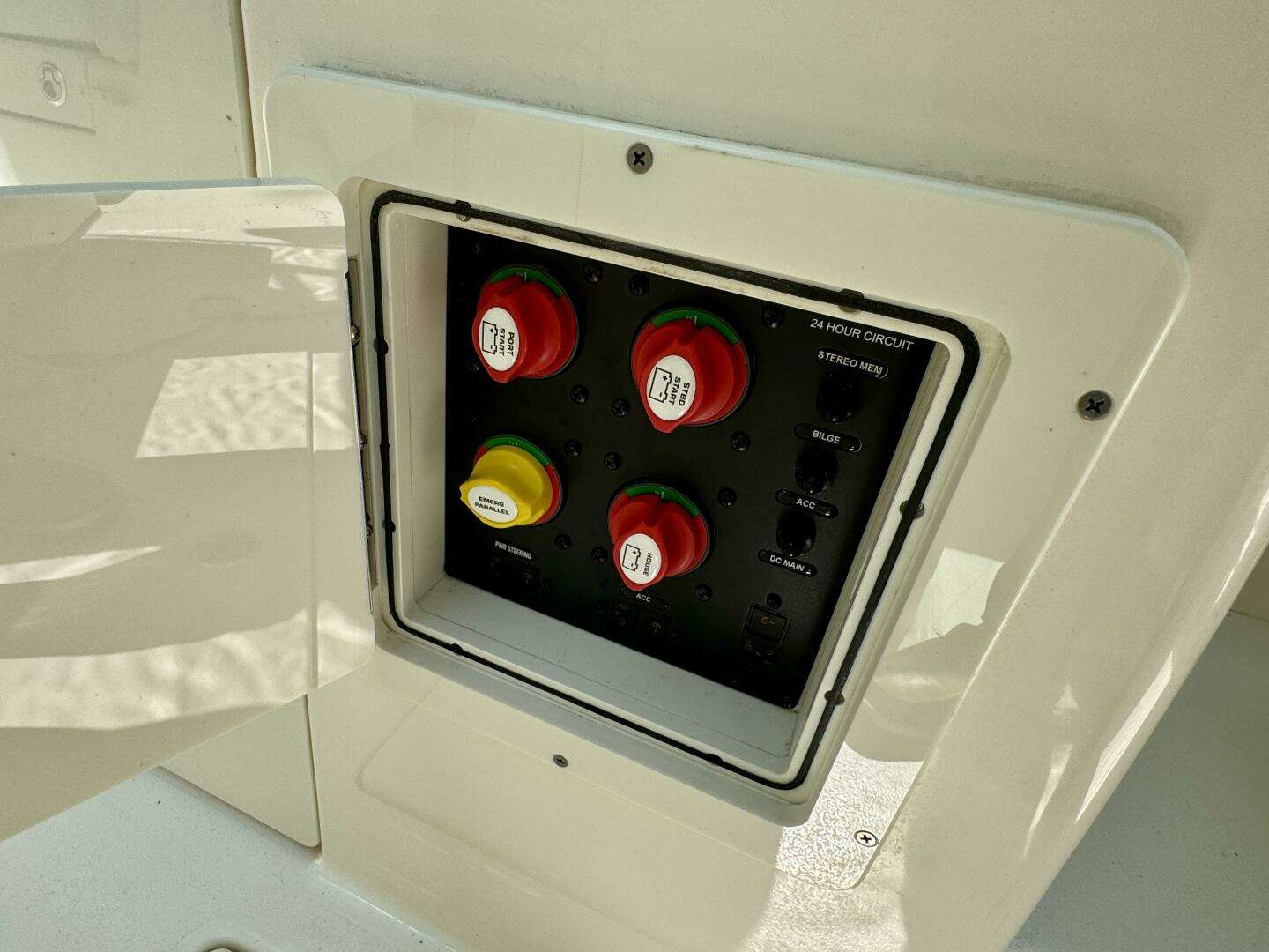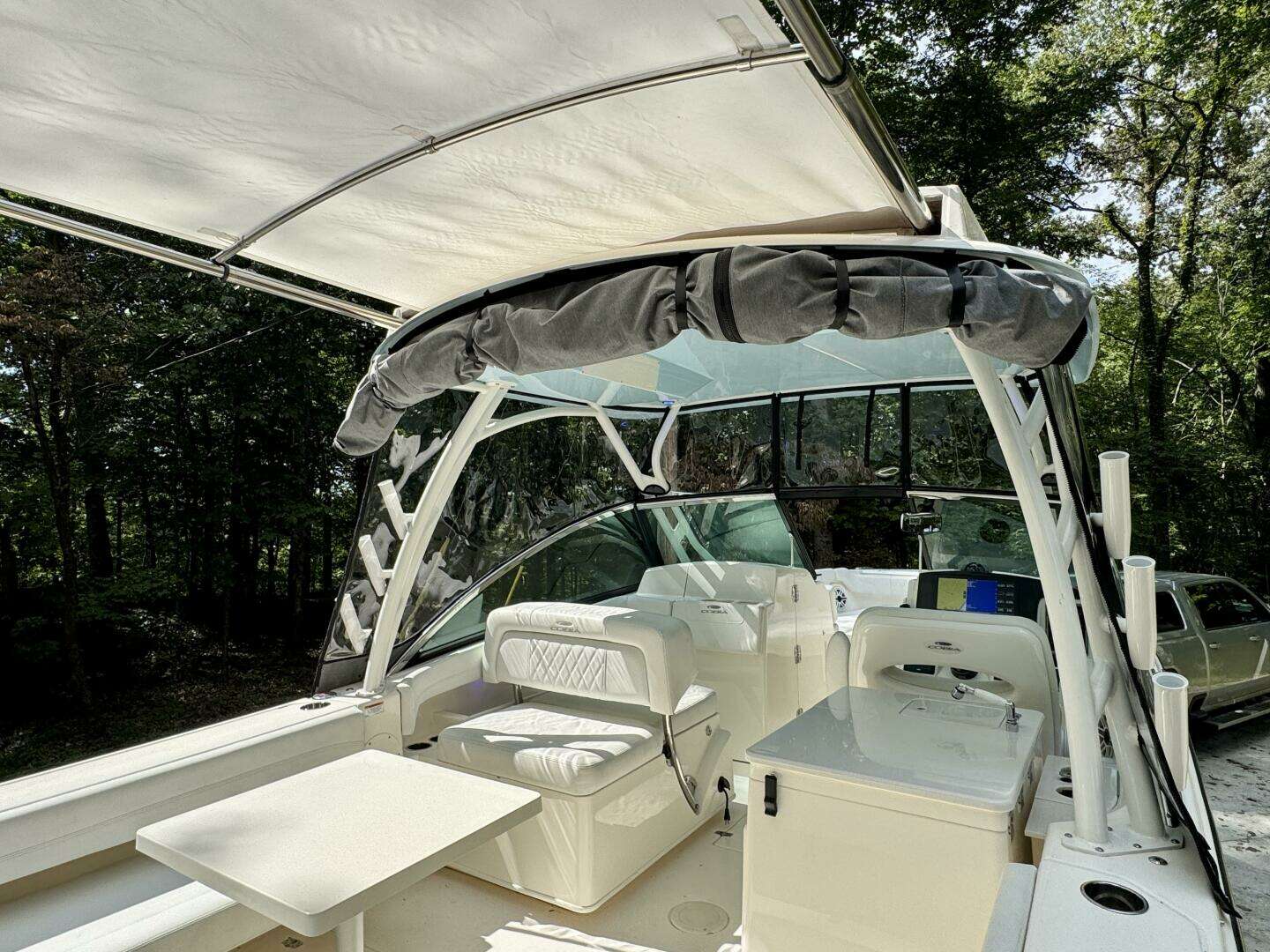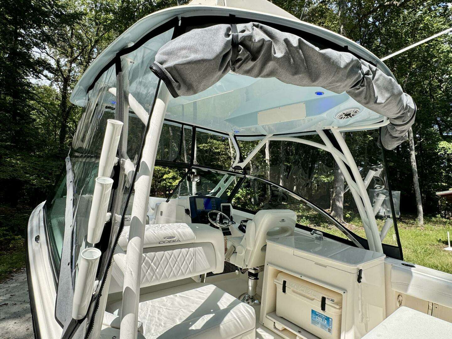 Overhead is a hard top with 2-tone gelcoat with powder coating package, an isinglass enclosure, forward/aft spreader lights, four of the eight cockpit speakers, integrated overhead lights, (6)rod holders, and a push-button electric full cockpit sunshade that extends from the hard top.