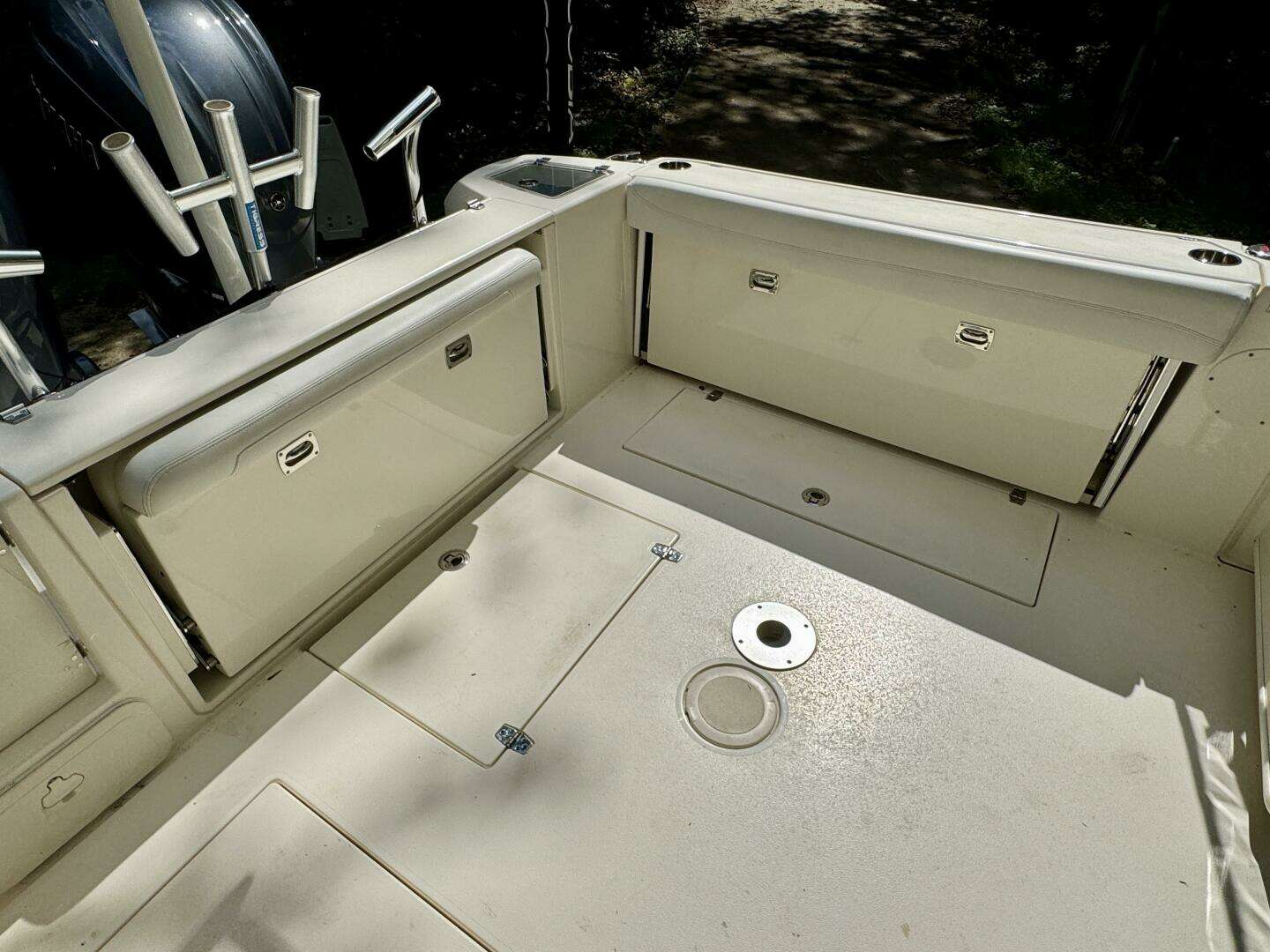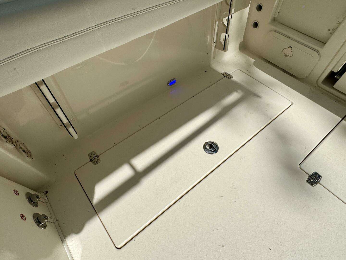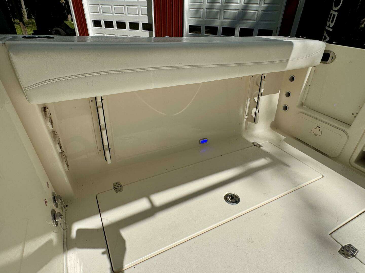 Turning your focus towards the aft of the 45sqft of cockpit space you'll find rod storage for three rods under the starboard gunnel, a transom door, (5)rod holders across the transom, plus (3)removable rocket launchers/rod holders, a 25-gallon aerated livewell, underwater lights below the transom, another handheld shower at the transom next to your stern 4-step swim boarding ladder, (2)insulated fish boxes with macerator pumpouts underfoot (one to port and one to starboard), plus hideaway fold out seating at the transom and the port side when the fishing is done and you're ready to cruise.