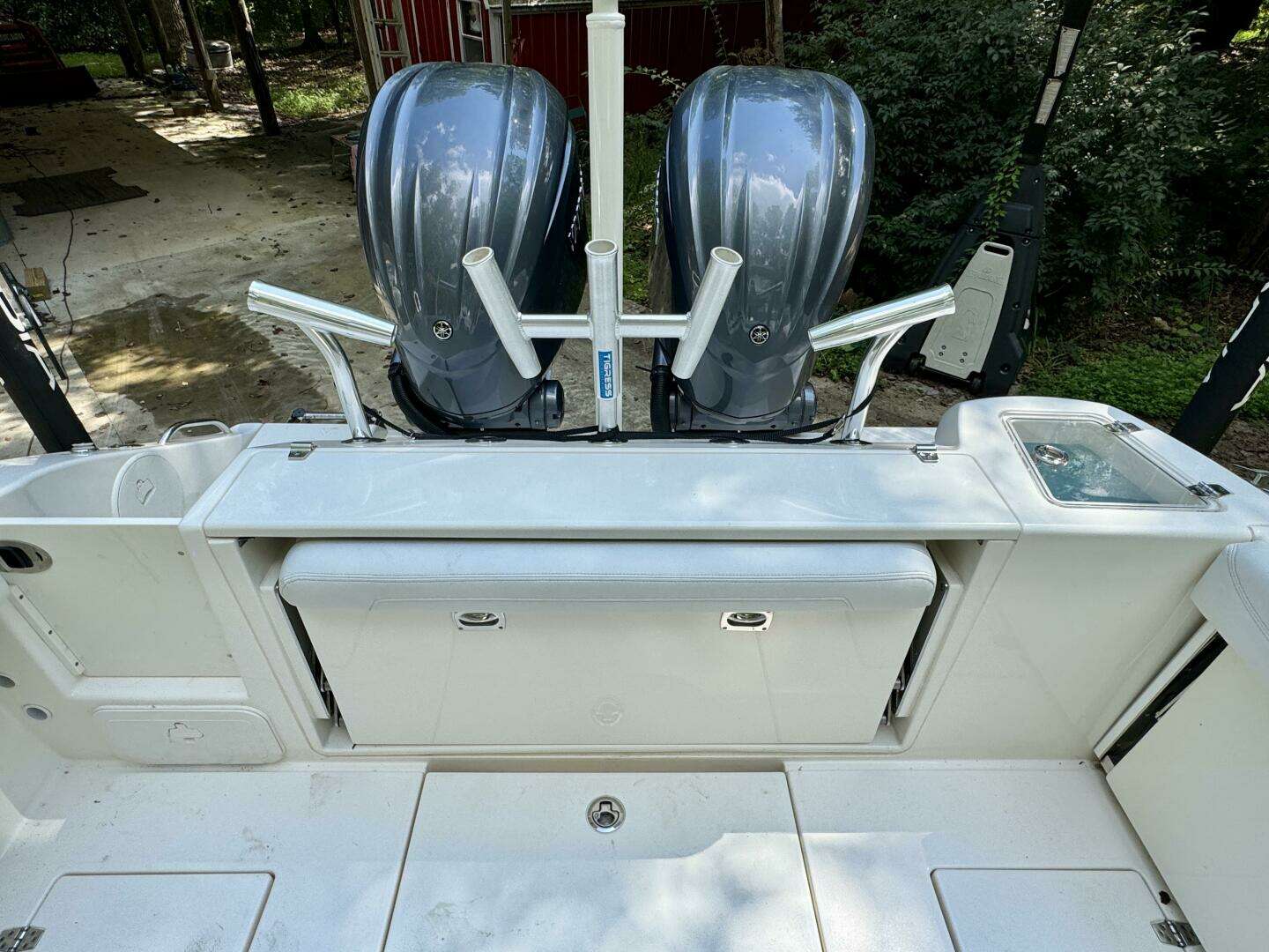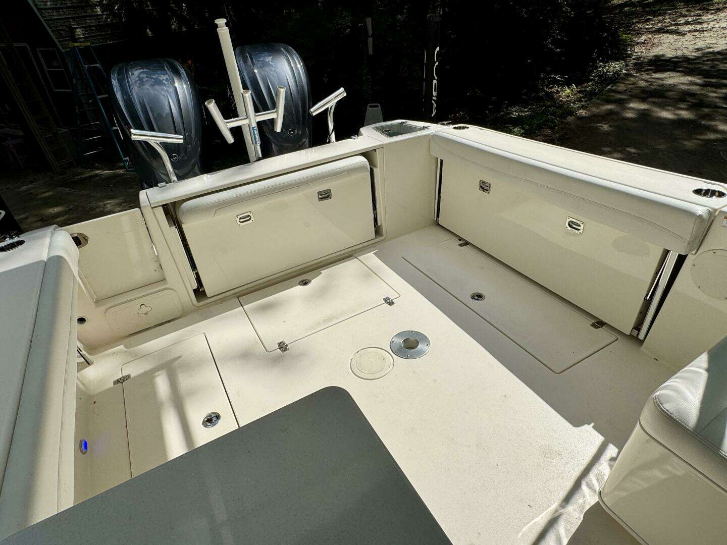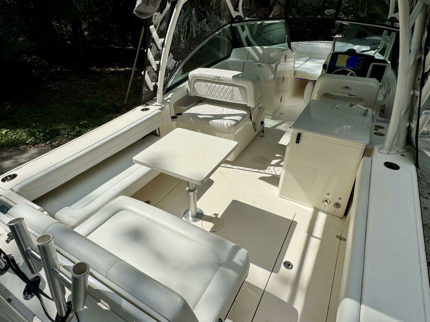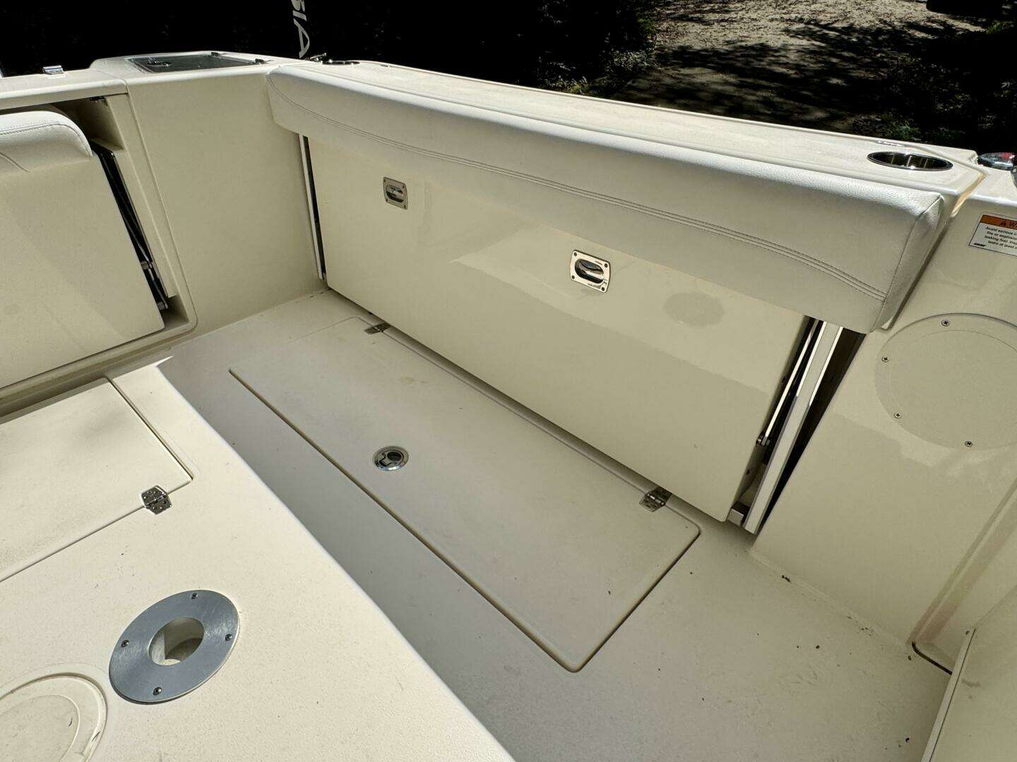 Turning your focus towards the aft of the 45sqft of cockpit space you'll find rod storage for three rods under the starboard gunnel, a transom door, (5)rod holders across the transom, plus (3)removable rocket launchers/rod holders, a 25-gallon aerated livewell, underwater lights below the transom, another handheld shower at the transom next to your stern 4-step swim boarding ladder, (2)insulated fish boxes with macerator pumpouts underfoot (one to port and one to starboard), plus hideaway fold out seating at the transom and the port side when the fishing is done and you're ready to cruise.