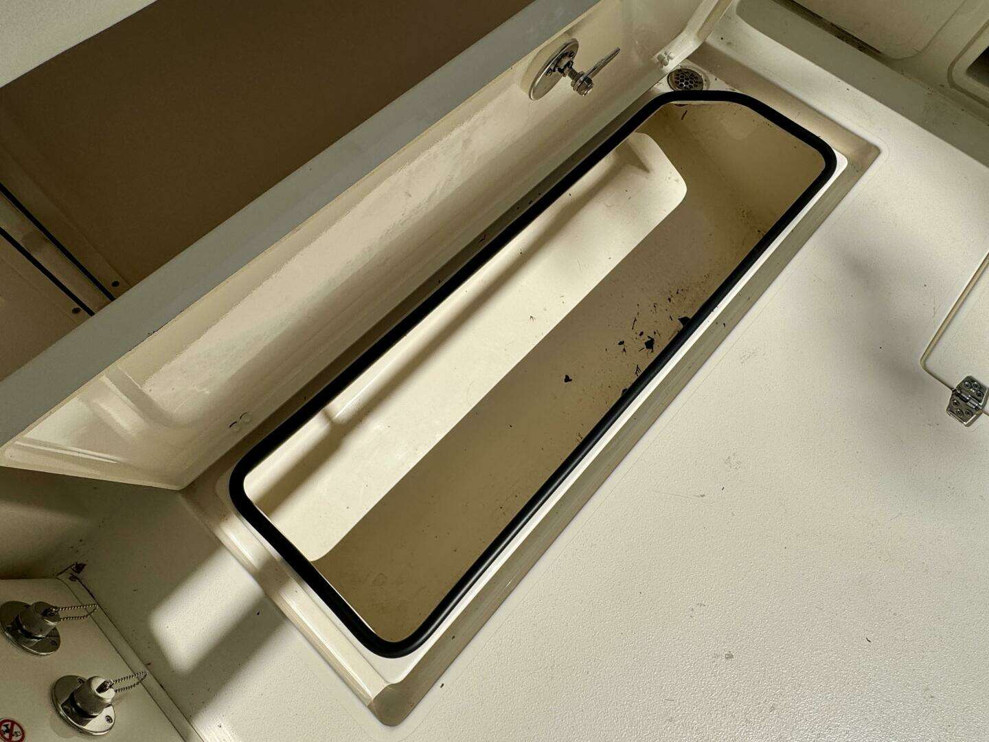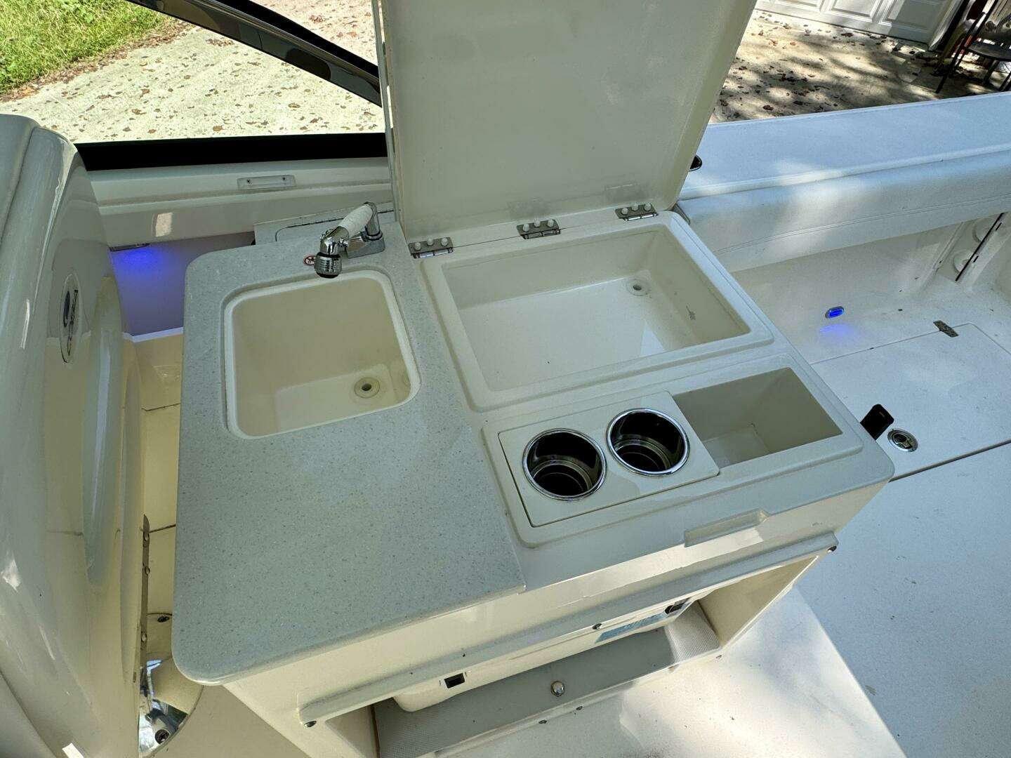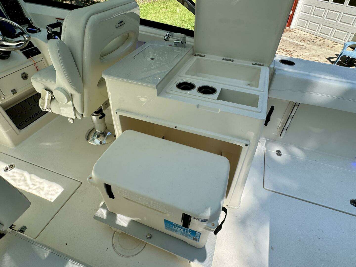 Behind the driver's helm you'll find an integrated kitchenette with a corian countertop, cockpit sink, slide-out 35quart Engel cooler, and a wine cooler. If you need more cooler space, there's an insulated 100quart cooler integrated into the base of the multi-positional forward/rear facing lounge seat that's to the port side of the driver's helm. Six of the 20 cupholders throughout are easily accessible from this lounge seat along with one of the four dual usb 12volt power outlets.