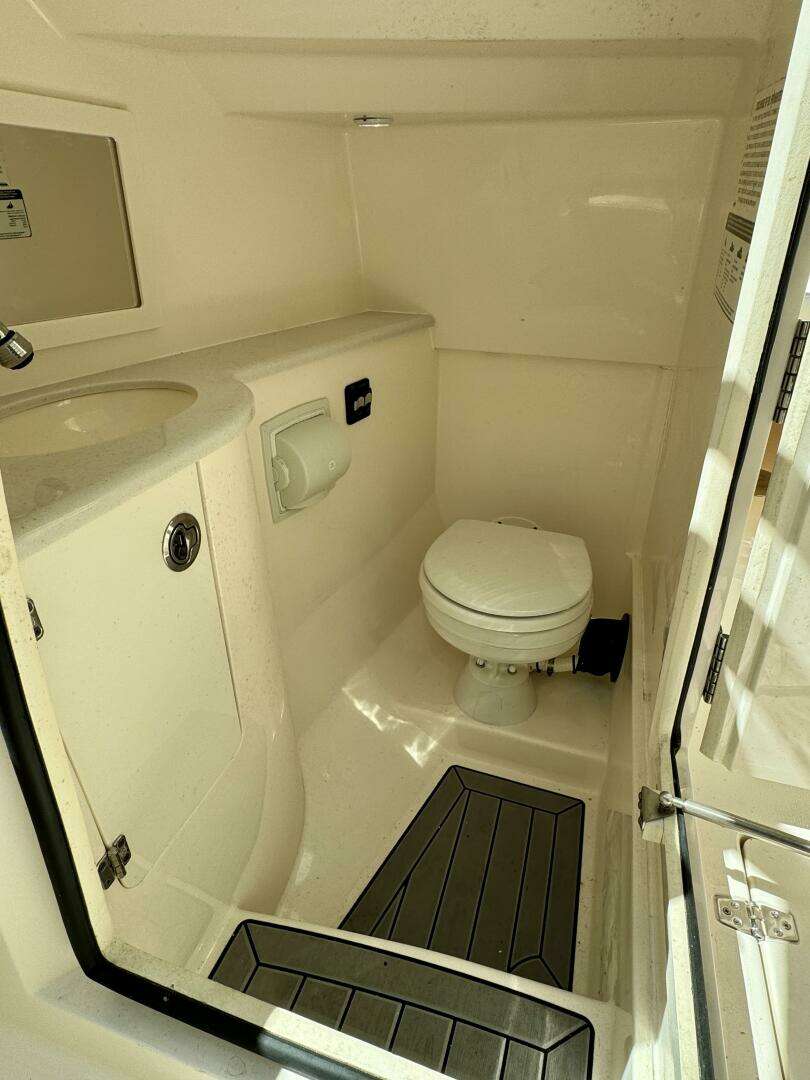 Just forward of the port side lounge seat you'll find the walk-down head compartment that's finished with corian countertops, a sink, mirror, lighted storage, an electric head with waste holding tank and dockside pumpout.