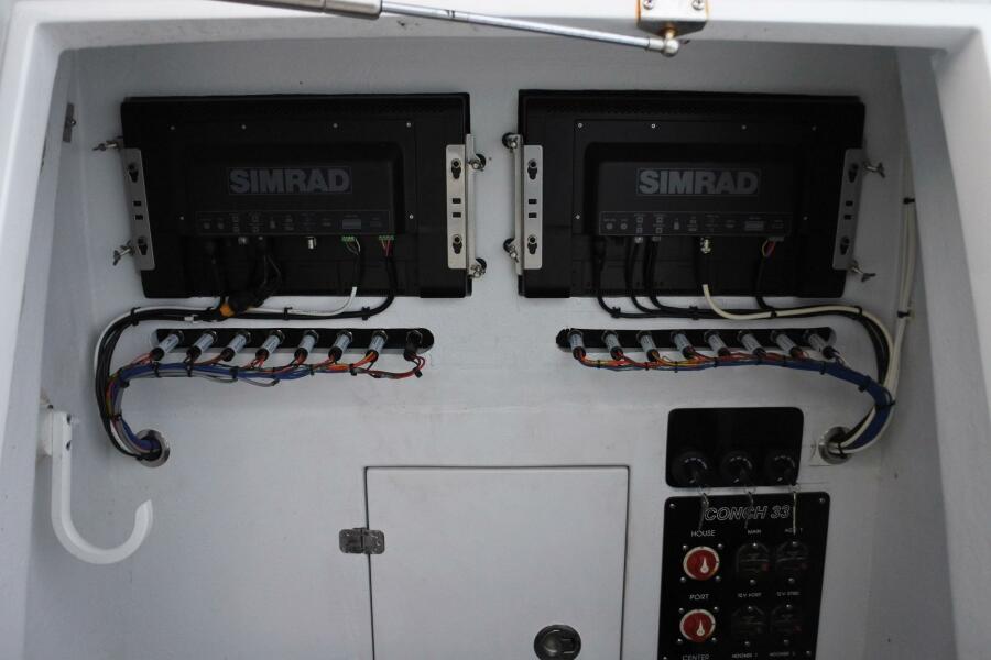 Outfitted with premium electronics, the helm features a Simrad Evo3 19" System Pack with GPS, keypad, and accessories, paired with a Halo 4' open-array radar, AP44 high-capacity autopilot, SS175 and 3D transducers with module, and Icom 330 VHF with built-in GPS. Connectivity and weather tracking are enhanced with an XM Weather Module and Starlink Mini.