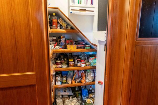 - Stainless steel work bench which lifts up to uncover custom shelving for spare parts to ensure things aren’t moving around when underway