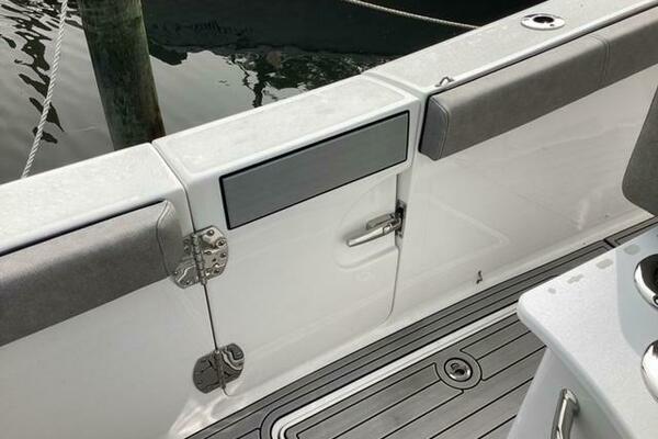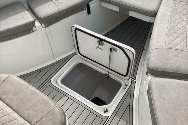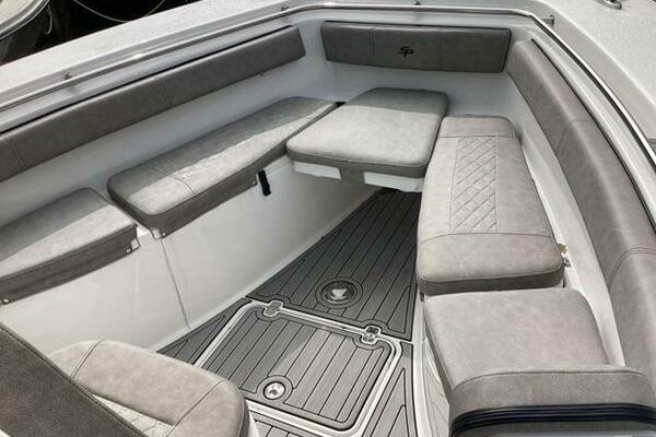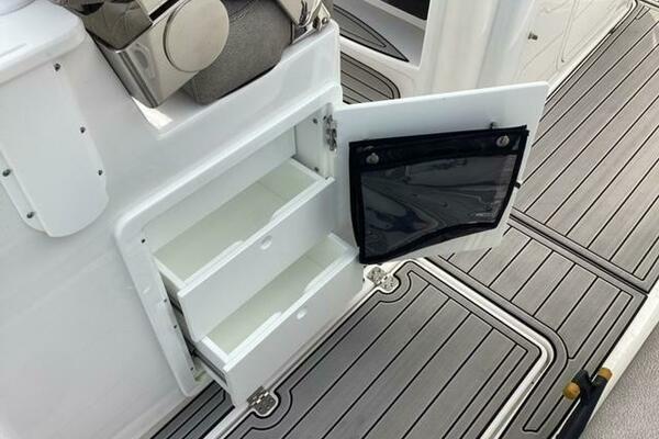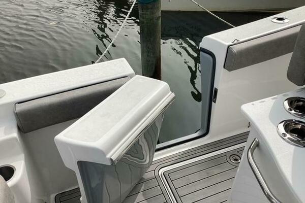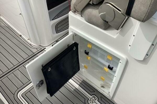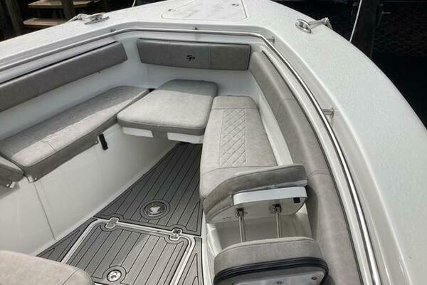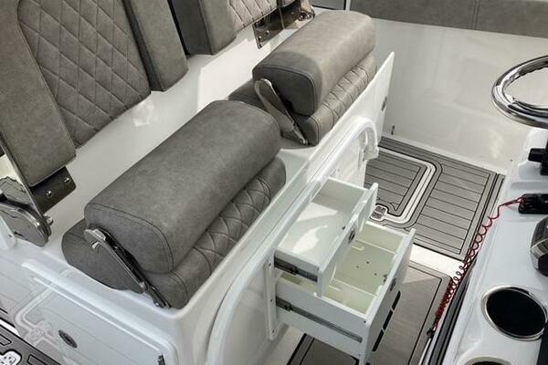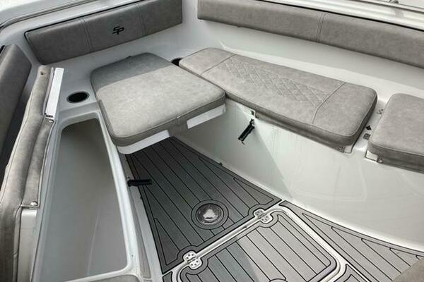 Make no mistake, fishing remains the priority. Aft, a pressurized 30-gallon livewell is centered at the transom, featuring a clear lid and rounded interior to avoid bait shock. Macerated fish boxes are found below the floor to both sides of the leaning post, and another insulated fish box awaits below the bow floor. Horizontal rod stowage is located within the starboard inwale. Thigh-high coaming bolsters wrap the perimeter. The leaning post, on our test boat upgraded to include LleBroc Billfish chairs with padded armrests and flip-up bolsters, features tackle drawers up front, nooks for knives and pliers, a cabinet portside with slide-out tackle boxes and an additional live well aft. The console features plenty of open space for a captain’s choice of electronics. Even the bow table favors fishing — it lowers to do double duty as a cast netting platform. For all the fishing focus, the 259 retains the ability to haul a crew in comfort. Aft, a cushioned bench folds out from its tucked-away position on the transom and features a backrest that rises and lowers. At the helm, those cushy Llebroc seats provide room for captain and passenger, and they add fold-down armrests. Forward, generously padded cushions snap in above all port and starboard storage lockers to provide bench seating. Slide-in backrests can be added for true forward-facing support and to let the crew stretch out in comfort. The seat on the front of the console also goes beyond the norm with a fully padded bottom and backrest, plus welcome grab handles integrated into the lid below.