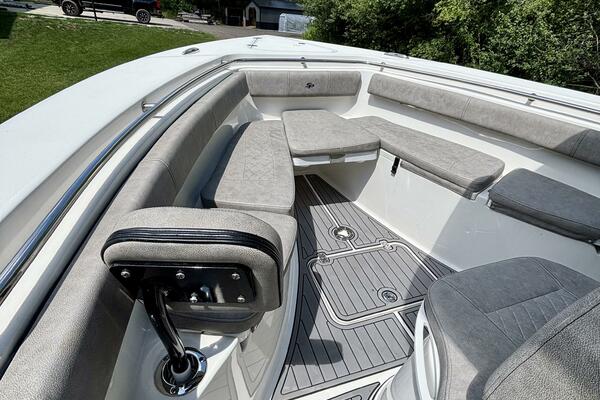 -Tons of seating – fold-down transom bench, bow loungers w/ backrests