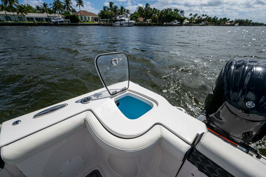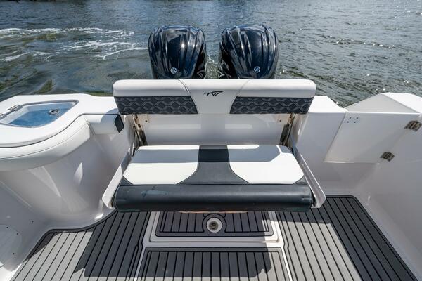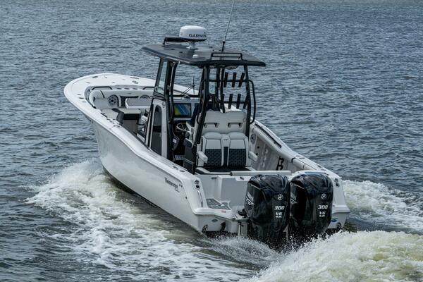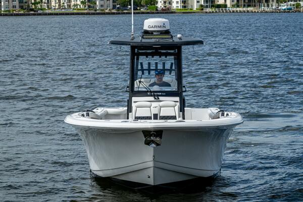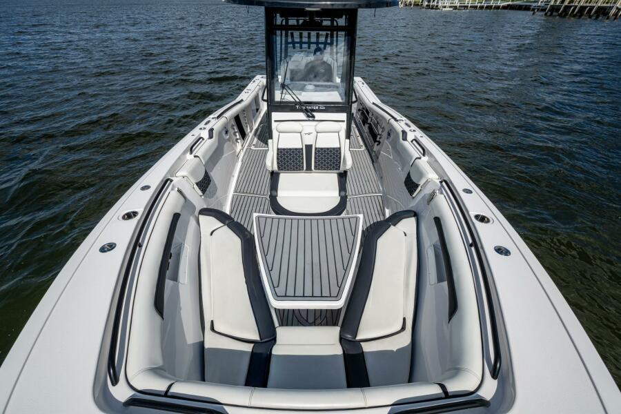 The 292CC combines a great fishing platform with plenty of seating for the family. Starting at the bow, this boat provides passengers with large wrap around bow seating, electric Hi-Low table, stow-away backrest, and large console lounge seat, usb charging. The yacht style helm station features two levels of footrest, laser cut switches, and plenty of room for it's to two 16" Garmin MFD's. The leaning post connects with the tee top mimicking Tidewater's 320CC and providing users with a very solid base. Two insulated floor macerated fish boxes, a side tuna door, and fold down rear bench seat complete this boat from mid-ship to stern.