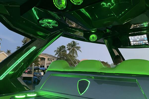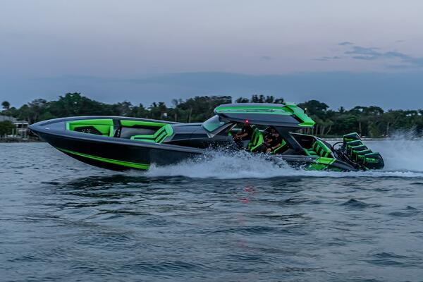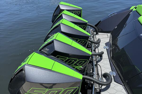 This 47-foot Adrenaline Reaper is powered by five Mercury 500R engines and built with advanced carbon fiber construction. It features a luxurious air-conditioned cabin, premium upholstery, and triple Garmin displays for top-tier navigation. Designed for performance and comfort
