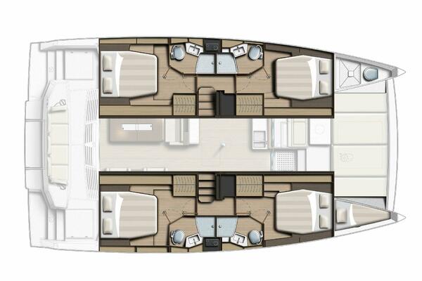Modern French design featuring the iconic "garage door" system connecting the salon to the aft cockpit, as well as the convenient door opening the galley to the forward cockpit, a feature rarely found on catamaran in her class. Spacious layout with symmetrical configuration featuring 4 cabins, each with private heads and separate shower stalls. Self-tacking jib, panoramic windows, flybridge seating.