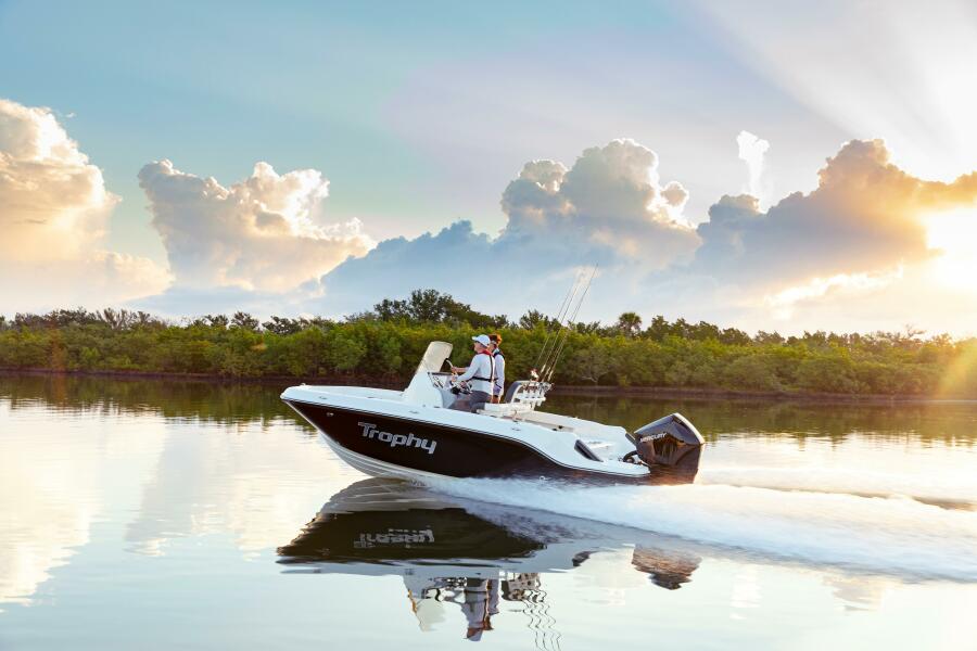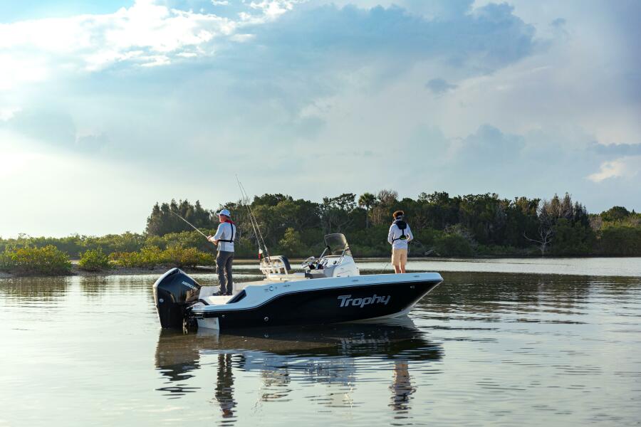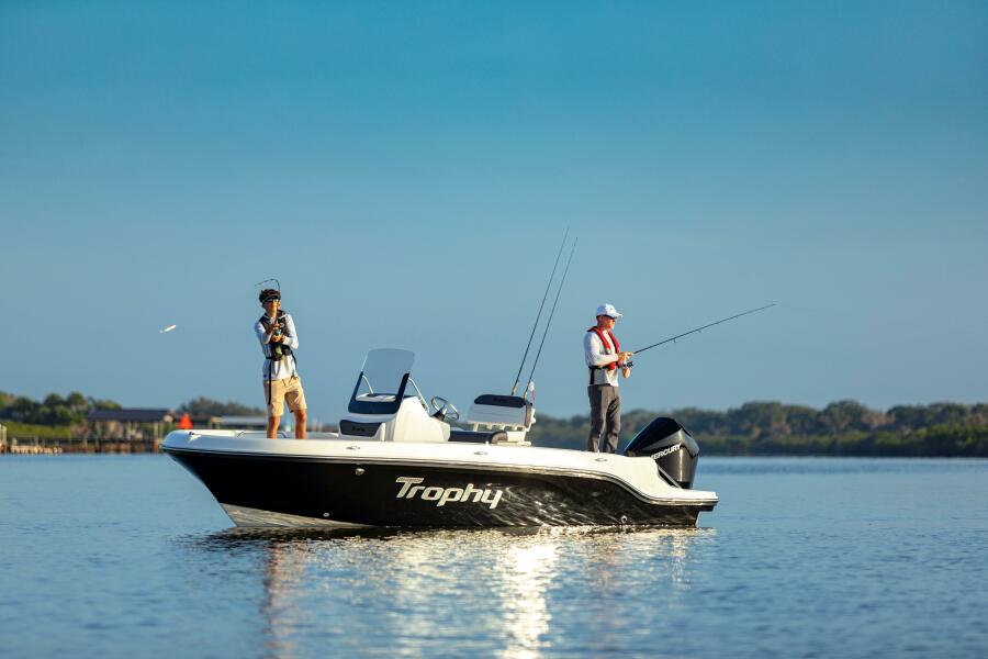 The Bayliner Trophy 20CC is a versatile 20-foot center console boat that combines fishing functionality with family-friendly features, offering a deep-V hull, self-bailing cockpit, enclosed head compartment, and optional ski tow pylon, making it suitable for both coastal fishing and recreational cru