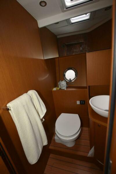 A three (3) cabin, two (2) head layout. She has a centerline queen berth in the bow with head and shower. There are port and starboard guest cabins with single berths. The galley is up along with a lower helm.
