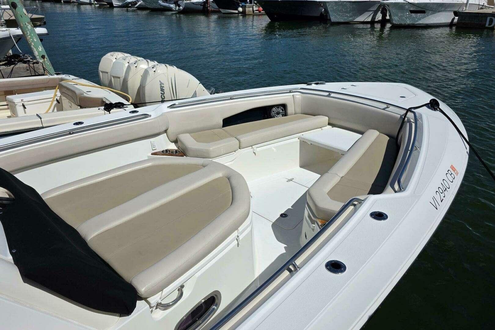 - Forward port and starboard seats with fold up lounge backrests, (4) drink holders, wireless stereo remote control, storage pockets in coaming with dual USB charging ports, fish box pump out switch