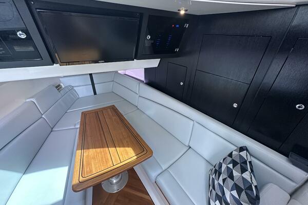 Teak Tables in Aft Deck Cabin and Bow Seating Area