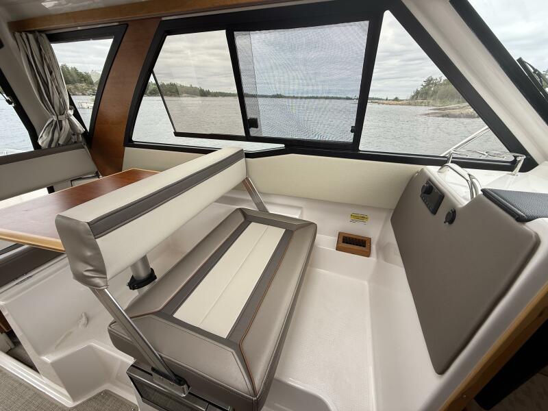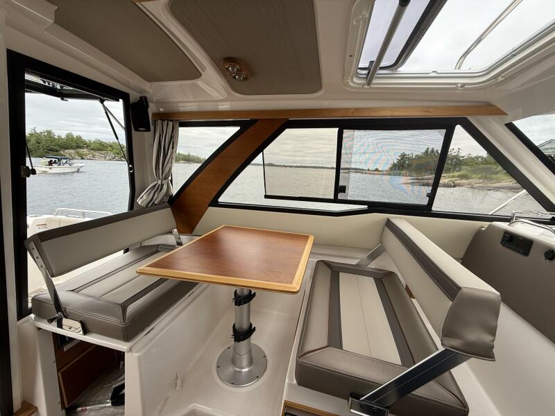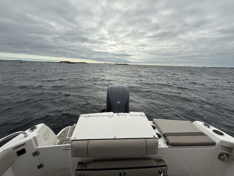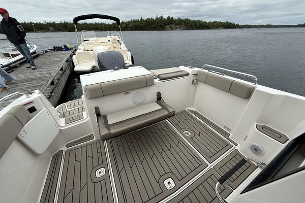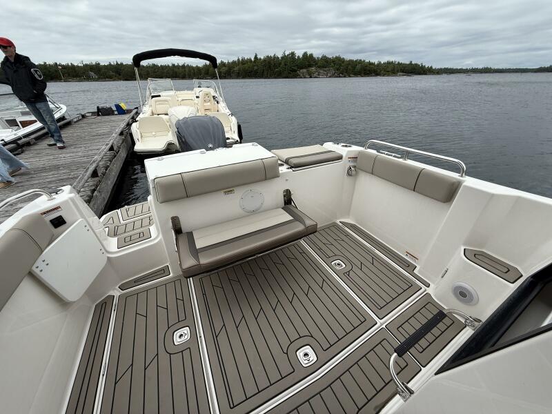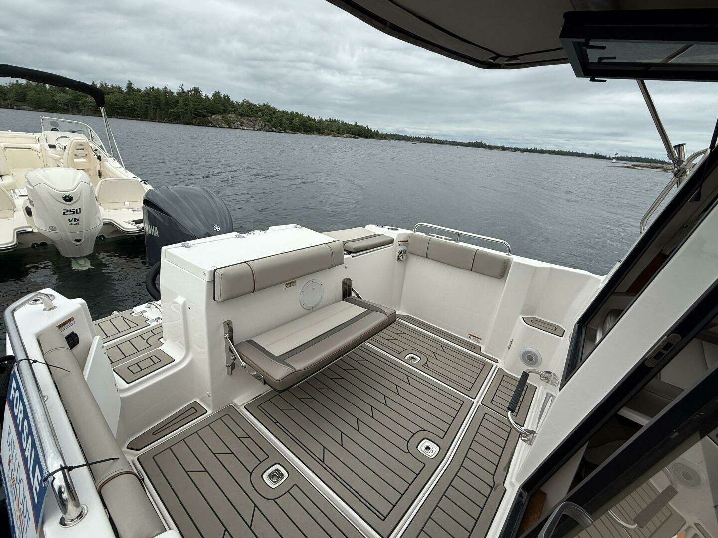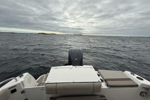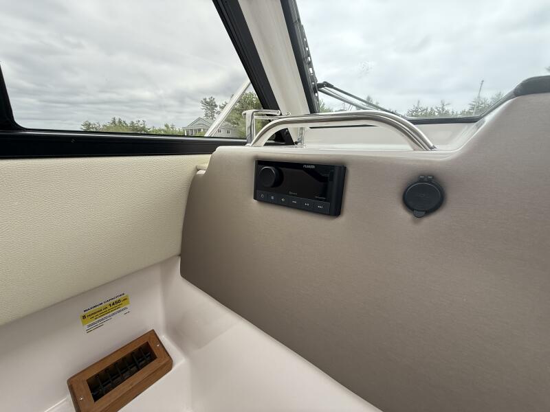 Standard features include a navigation package starring the Garmin Touchscreen GPS chartplotter with sonar, color Yamaha engine display, VHF radio, Bluetooth-enabled Fusion stereo system, LED lighting, marine head with holding tank, sport racks, built-in rod holders, fish box, integrated transom cooler, concealed ski tow, our built-in trailer lights, foldaway cockpit seating, cockpit bolster cushions, and much more.