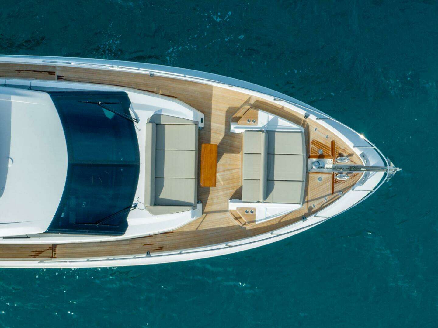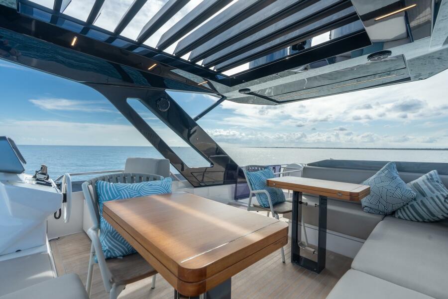 - Expansive flybridge with versatile lounging, dining, and sunbathing areas – the most spacious in its class.