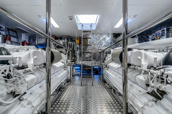 The machinery space is accessed via a watertight centreline deck hatch on the aft deck or via the hatch on the starboard side deck. The machinery space houses the main engines, transmissions, generators, shore power transformer units, two gyroscopic stabilizer units, hydraulic pump unit for stabilizer fins and thrusters, majority of air conditioning plant, steering gear, batteries and chargers and majority of seacocks.
