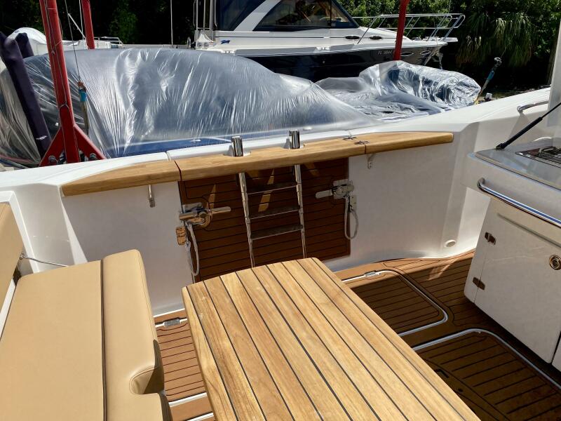 - A fold-down hull side, creating a massive extension of the cockpit for guests, anglers, diving, or lounging