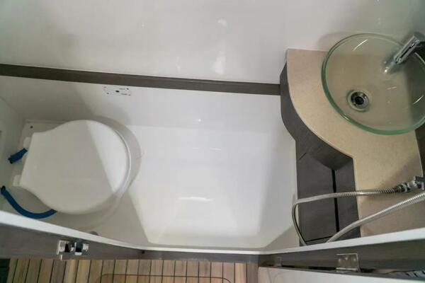 Step below and the cabin reveals that this boat is built for more than day trips. A full head with shower, flat-screen TV, and refrigerator make overnighting or long weekends effortless.