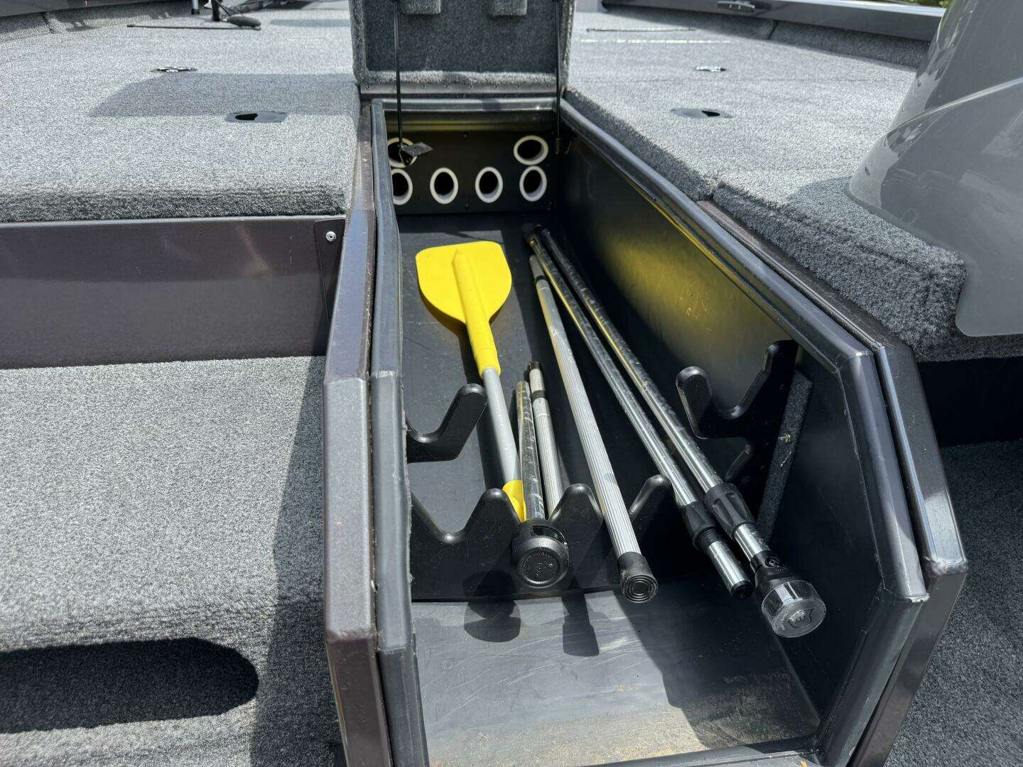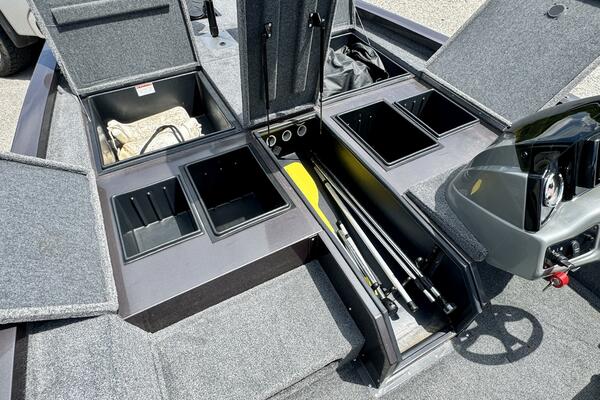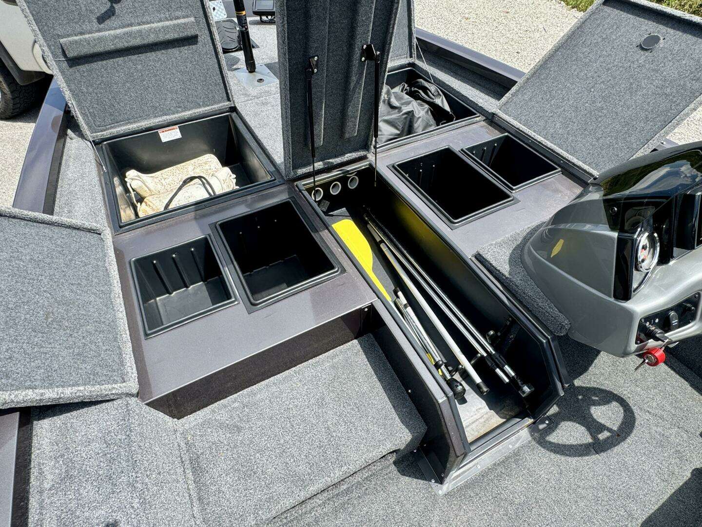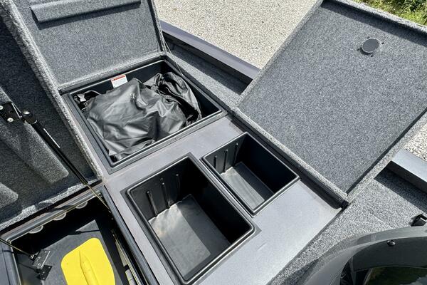 A 33-gallon divided livewell is automatically aerated and flanked by twin tackle-storage boxes. A large aft hatch gives access to the batteries, engine rigging, and an optional three-bank charger.