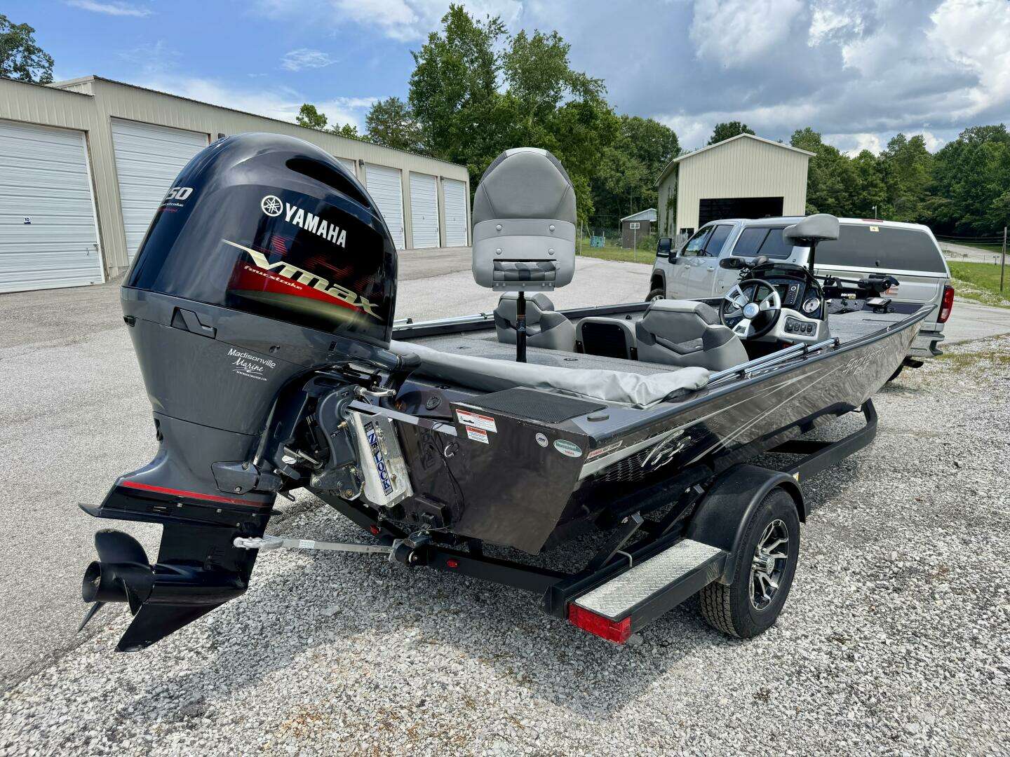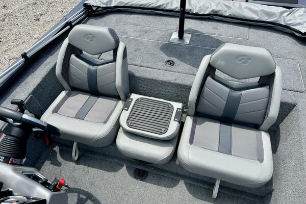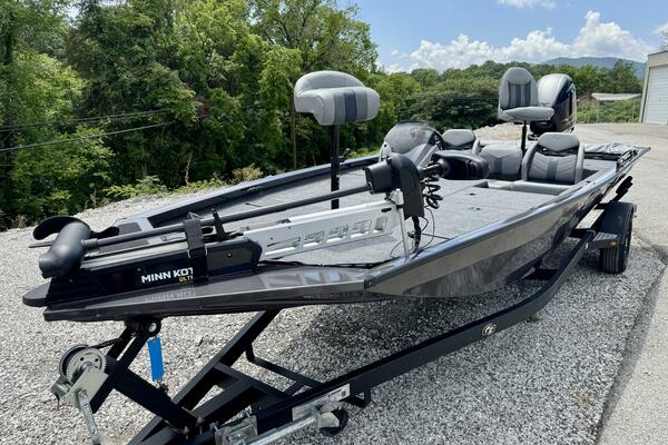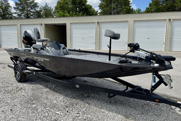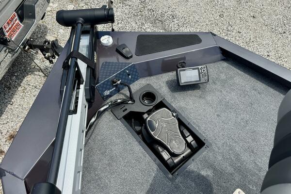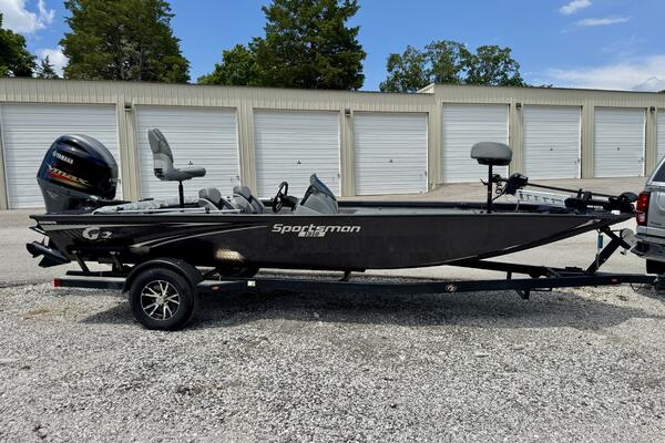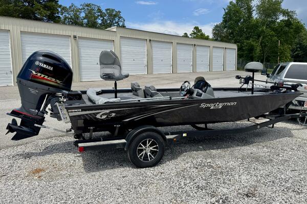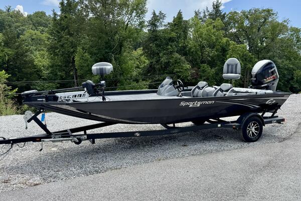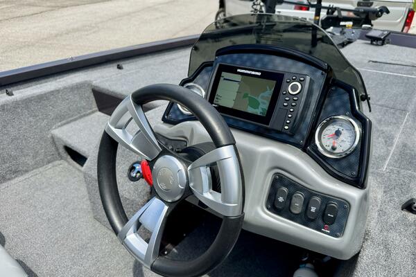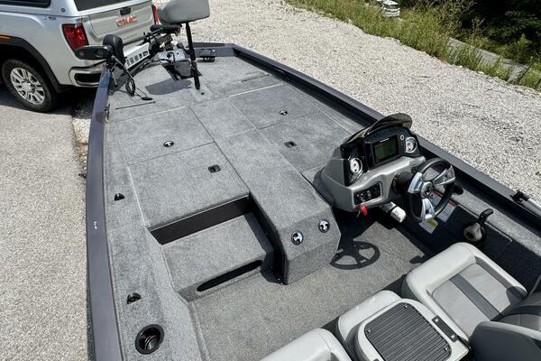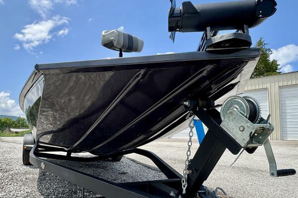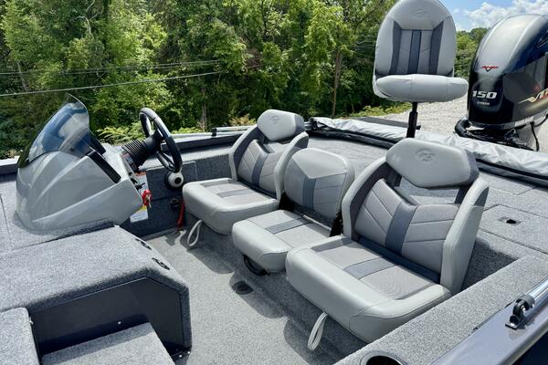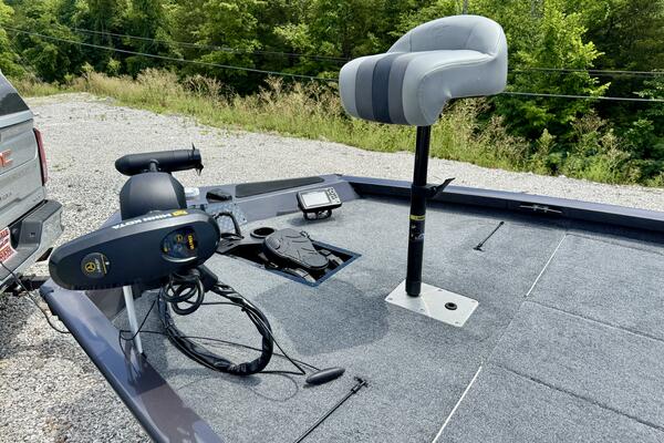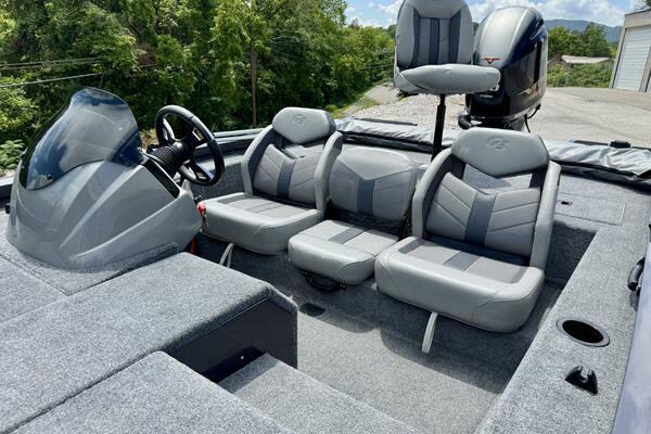 This One-Owner, Freshwater 2023 G3 Boats Sportsman 1910 All Welded Aluminum Fishing Boat, Motor, and Trailer For Sale near Norris Lake Tennessee is equipped with a 150HP Yamaha Super High Output V-max 4-Stroke outboard motor and features an upgraded MinnKota Ultrex iPilot 80lbs thrust trolling motor with recessed mounted foot pedal controller, a Humminbird Helix 5 GPS/Chartplotter/Depth/Fish Finder/Sonar, and an adjustable Bike/Casting seat at the bow with plenty of storage underfoot - including two lockable dry storage boxes, 8.5' lockable rod storage for six rods, 6 tackle storage boxes, a 33-gallon auto-aerated divided livewell, plus a 3-bank onboard battery charger. You'll also find storage under the plush driver and passenger seats while the center seat folds forward for an integrated step to the stern fishing seat. The single console houses two analog gauges with a Humminbird Helix 7 GPS/Chartplotter/Depth/Fish Finder/Sonar, a three spoke tilt steering wheel with Baystar hydraulic steering, and a tinted windscreen. Three cupholders are located throughout, four mooring cleats are mounted on the inside hull edge, a bimini top, mooring cover, and single axle trailer with rubber-infused Kodiak coating are all included. Transferable G3, Yamaha, & Y.E.S. Warranties run through 8/17/2026 & 8/17/2028!