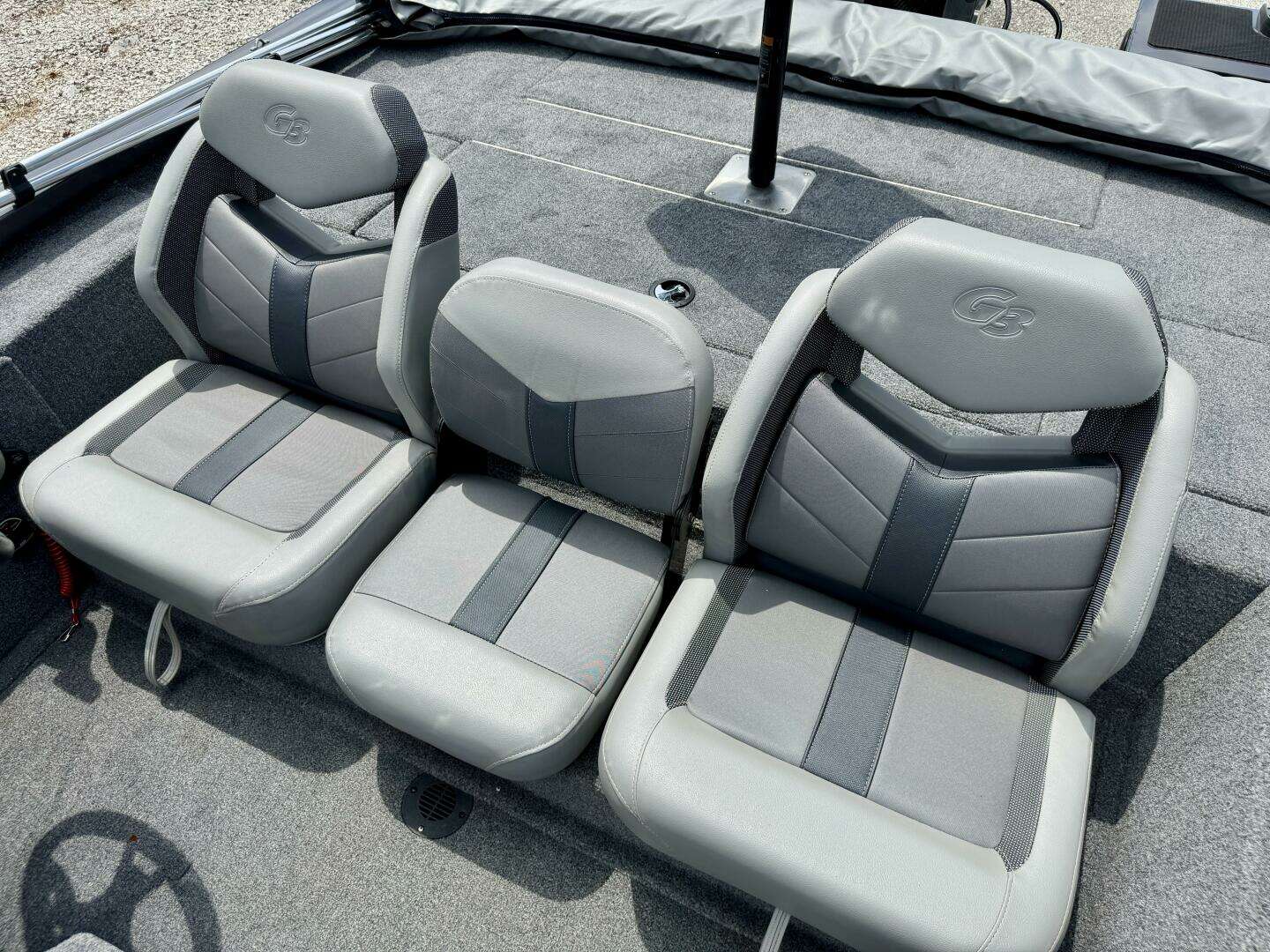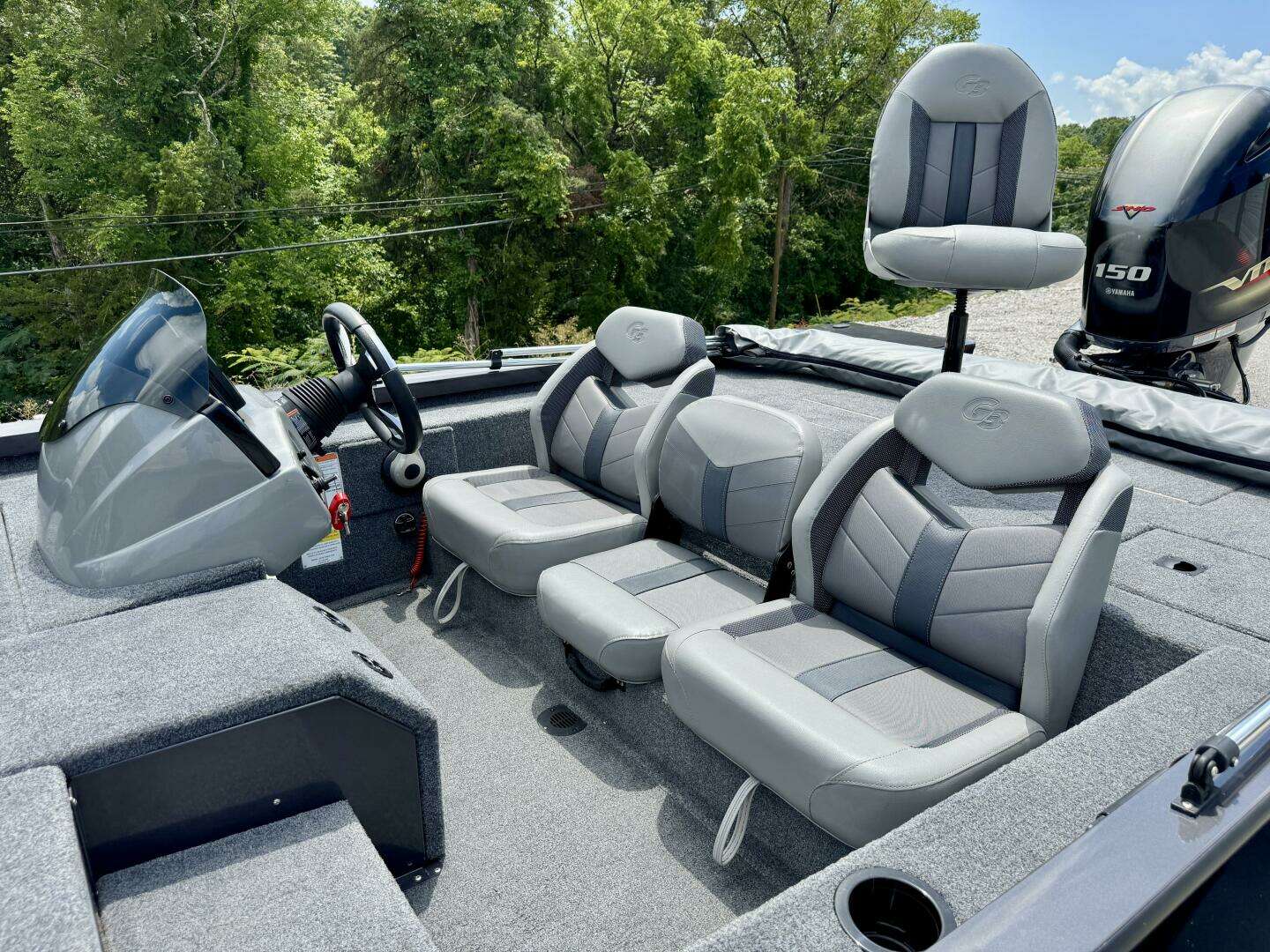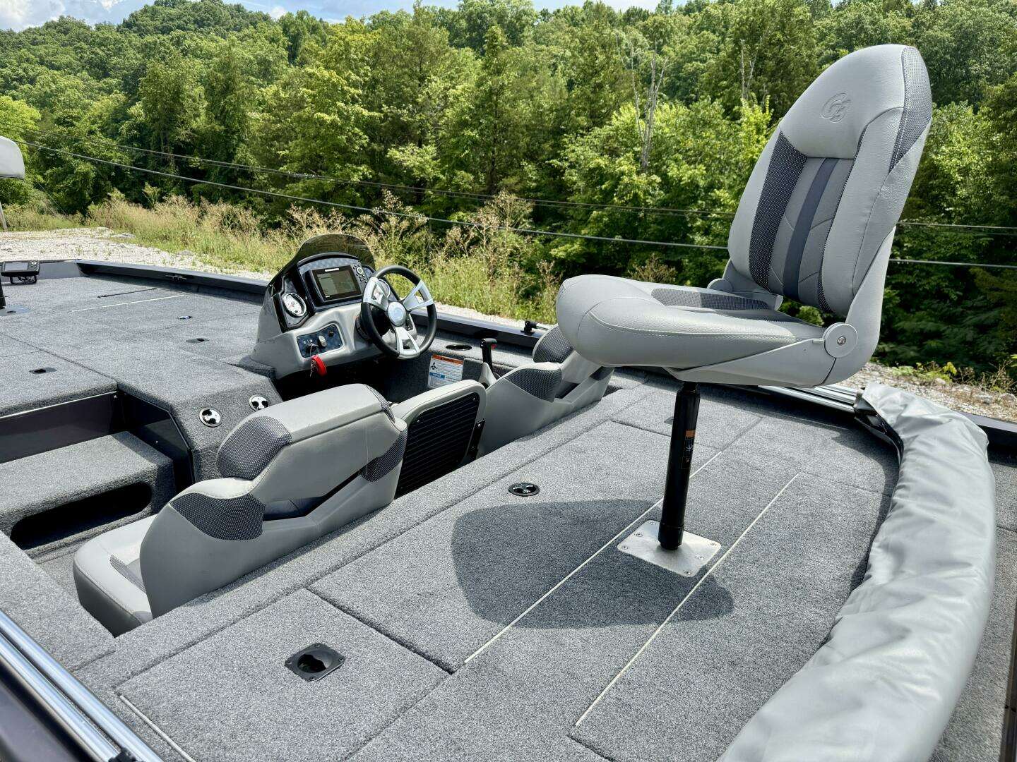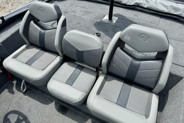 This One-Owner, Freshwater 2023 G3 Boats Sportsman 1910 All Welded Aluminum Fishing Boat, Motor, and Trailer For Sale near Norris Lake Tennessee is equipped with a 150HP Yamaha Super High Output V-max 4-Stroke outboard motor and features an upgraded MinnKota Ultrex iPilot 80lbs thrust trolling motor with recessed mounted foot pedal controller, a Humminbird Helix 5 GPS/Chartplotter/Depth/Fish Finder/Sonar, and an adjustable Bike/Casting seat at the bow with plenty of storage underfoot - including two lockable dry storage boxes, 8.5' lockable rod storage for six rods, 6 tackle storage boxes, a 33-gallon auto-aerated divided livewell, plus a 3-bank onboard battery charger. You'll also find storage under the plush driver and passenger seats while the center seat folds forward for an integrated step to the stern fishing seat. The single console houses two analog gauges with a Humminbird Helix 7 GPS/Chartplotter/Depth/Fish Finder/Sonar, a three spoke tilt steering wheel with Baystar hydraulic steering, and a tinted windscreen. Three cupholders are located throughout, four mooring cleats are mounted on the inside hull edge, a bimini top, mooring cover, and single axle trailer with rubber-infused Kodiak coating are all included. Transferable G3, Yamaha, & Y.E.S. Warranties run through 8/17/2026 & 8/17/2028!