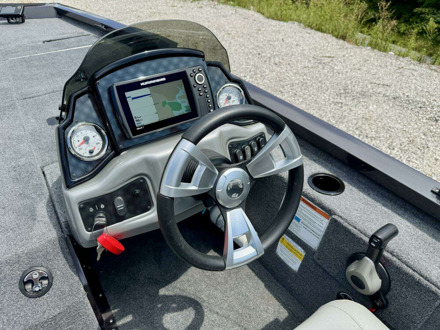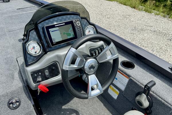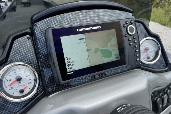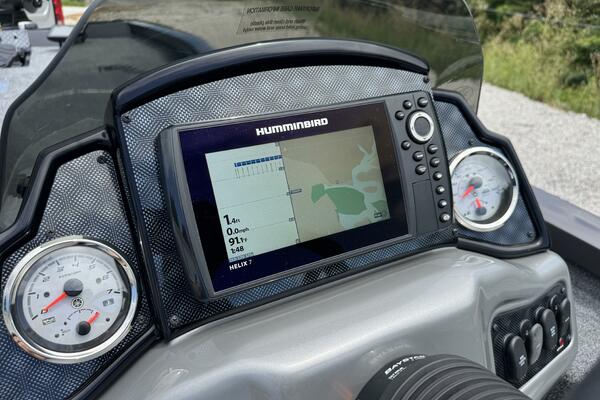 The Sportsman has a thick, 0.100-gauge aluminum all-welded hull. The bow features large dry-storage boxes as well as tackle-storage lockers flanking the center rod locker. Our tester was equipped with an optional MinnKota Ultrex trolling motor; a Maxum 24v 70-pound thrust troller is standard. The Helix 9 CHIRP on our dash was an upgrade (5-inch is standard); the 9-inch Helix at the bow is optional.